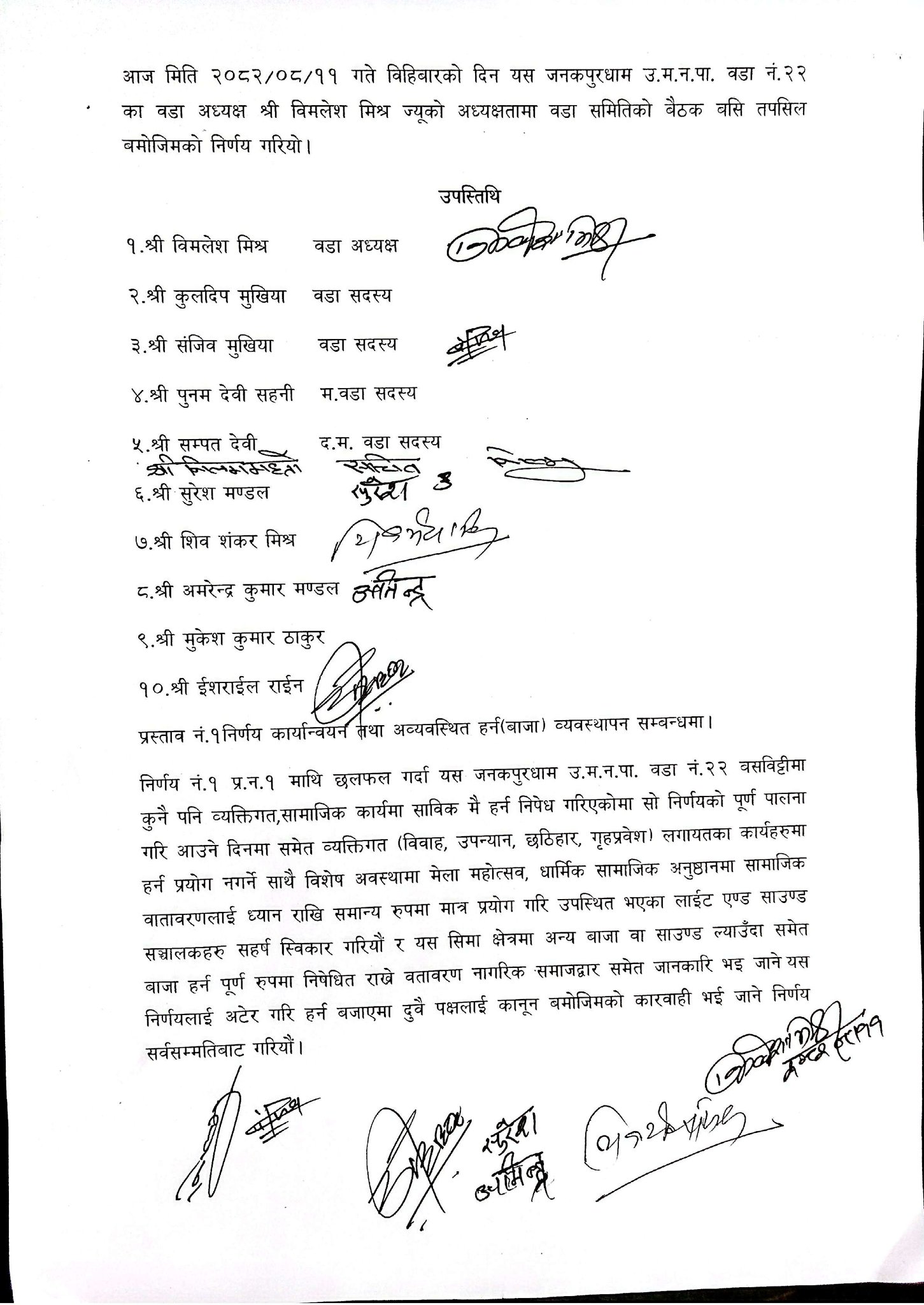बिहीबार वडा अध्यक्ष विमलेश मिश्रको अध्यक्षतामा बसेको वडा समितिको बैठकले ध्वनि प्रदूषण नियन्त्रण र सामाजिक वातावरण समुचित राख्ने उद्देश्यसहित हर्न व्यवस्थापन सम्बन्धी महत्वपूर्ण निर्णयहरू सर्वसम्मतिमा पारित गरेको हो ।