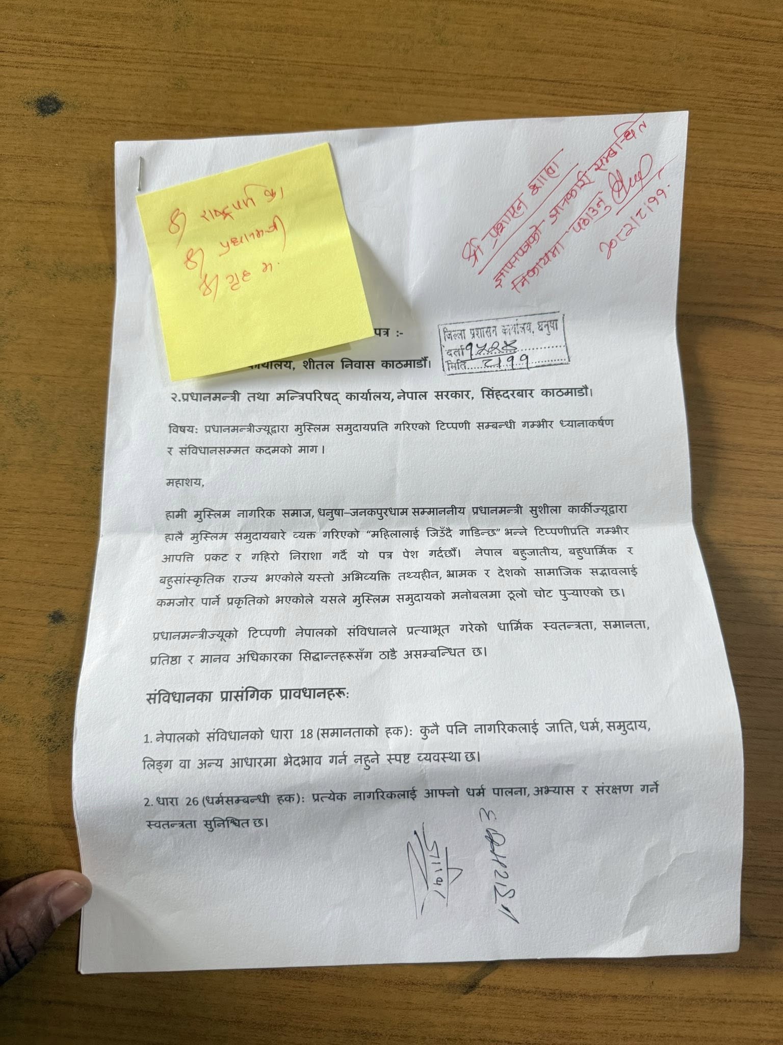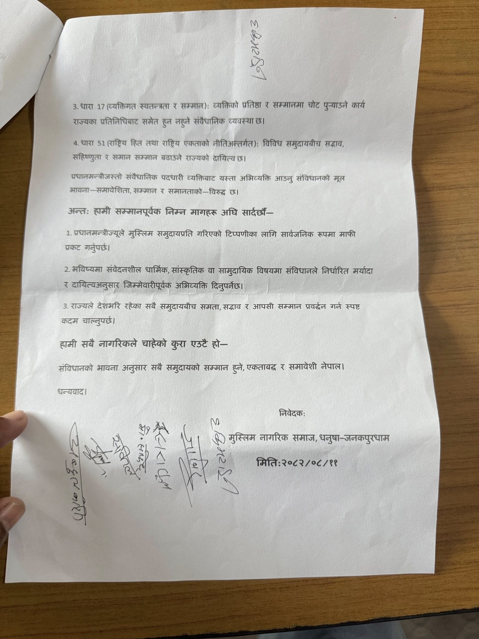 मुस्लिम नागरिक समाजले धनुषाका प्रमुख जिल्ला अधिकारी प्रेम प्रसाद लुईंटेललाई बुझाएको ध्यानाकर्षण पत्रमा भनिएको छ, ‘प्रधानमन्त्रीको अभिव्यक्ति बहुजातीय, बहुधार्मिक र बहुसांस्कृतिक नेपालको सामाजिक बनोट र संवैधानिक मूल्यविपरीत छ ।’