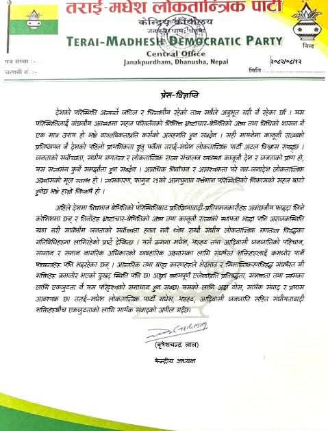 पार्टीका केन्द्रीय अध्यक्ष बृषेशचन्द्र लालले जारी गरेको विज्ञप्तिमा देशलाई स्थिरता, विधिको शासन र लोकतान्त्रिक मार्गमा फर्काउने एक मात्र उपाय कानूनी राज्यको दृढ प्रतिष्ठापन भएको उल्लेख छ ।