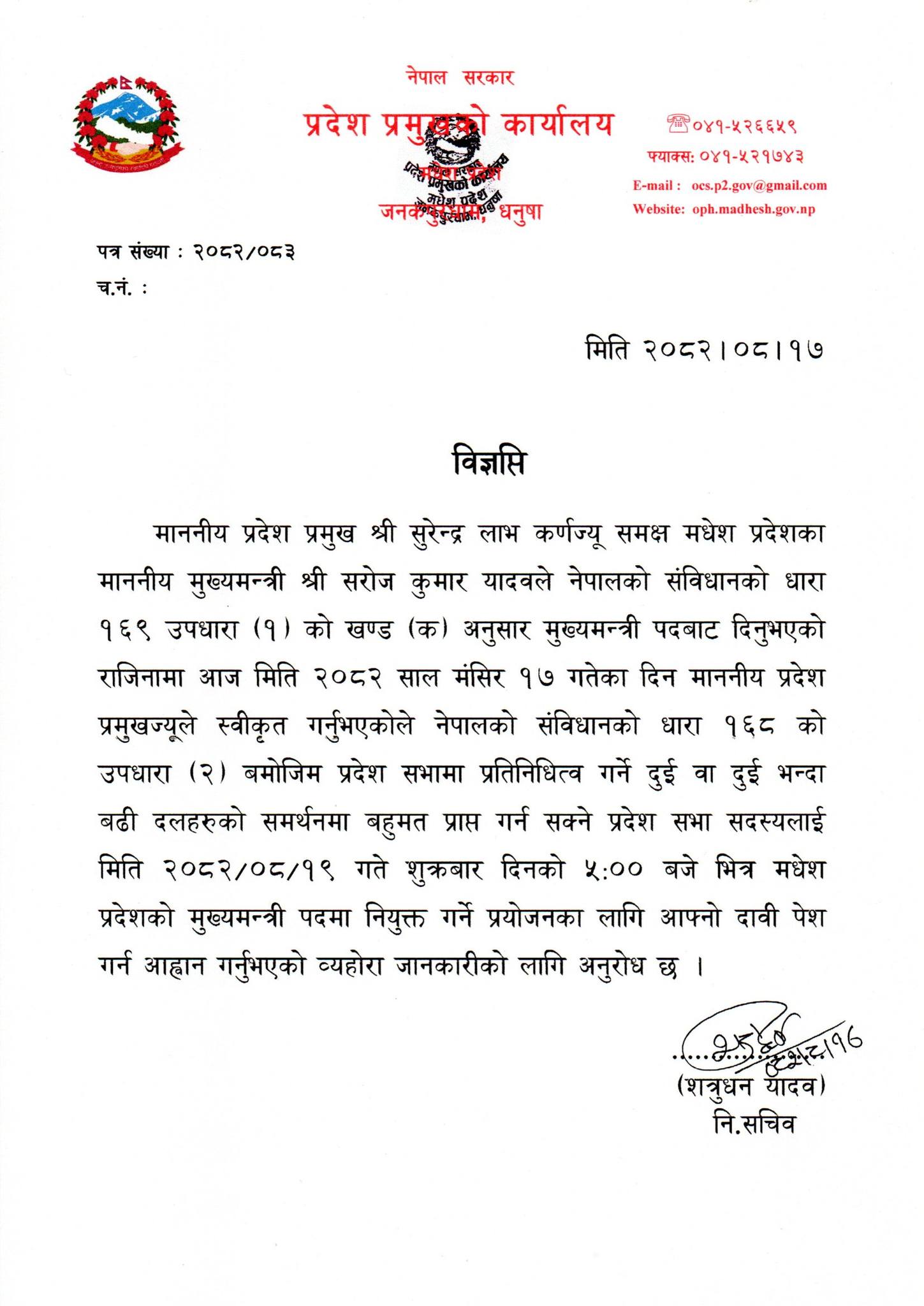 विज्ञप्तिमा भनिएको छ, ‘प्रदेशसभामा प्रतिनिधित्व गर्ने दुई वा दुईभन्दा बढी दलहरूको समर्थनसहित बहुमत प्राप्त गर्न सक्ने प्रदेशसभा सदस्यले तोकिएको समयभित्र मुख्यमन्त्री पदका लागि दावी पेश गर्न अनुरोध गरिएको छ ।’