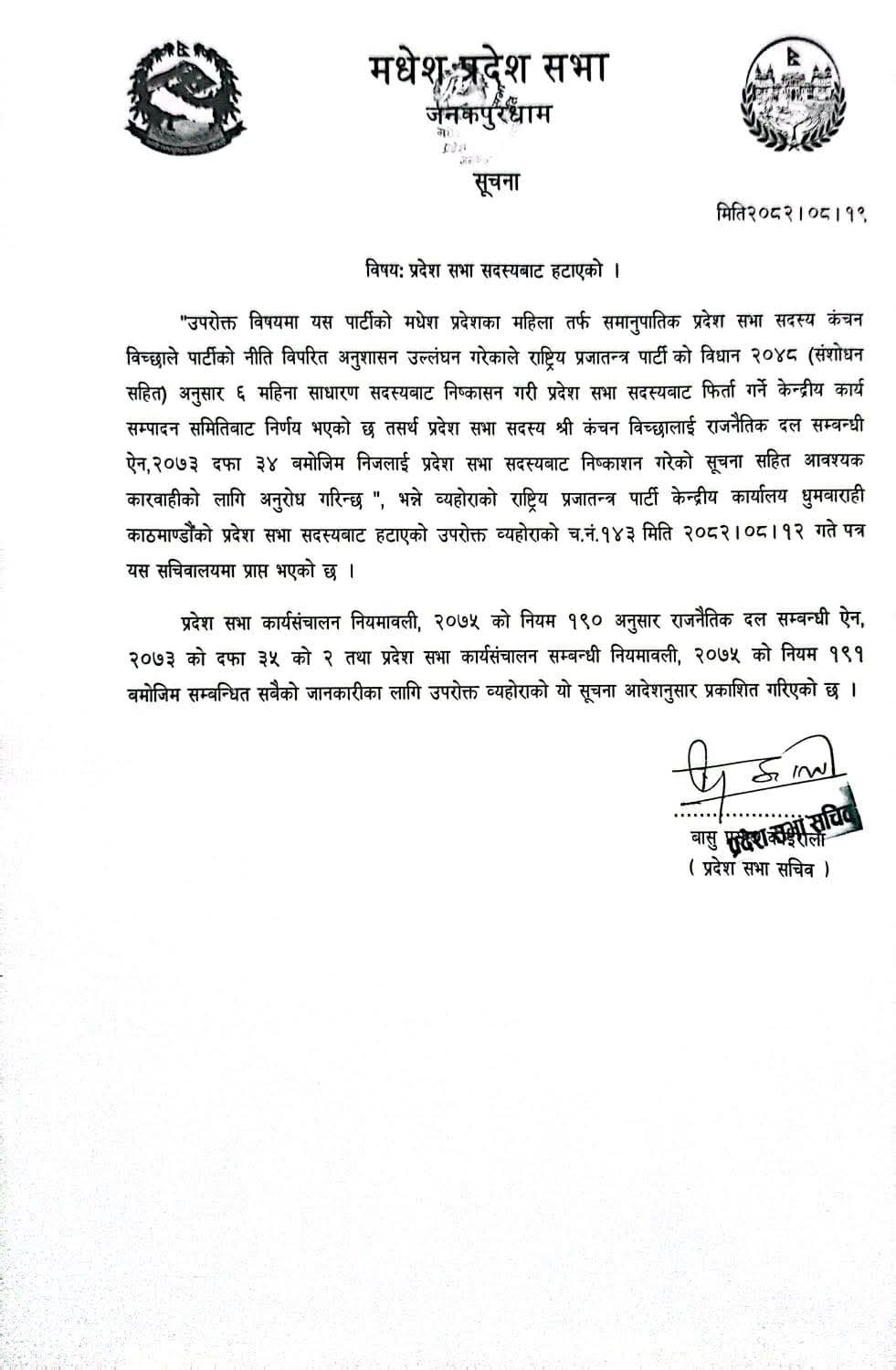 सो सम्बन्धी पत्र राप्रपाको केन्द्रीय कार्यालय धुम्बाराहीबाट मधेश प्रदेश सभा सचिवालयमा प्राप्त भएको सचिवालयले जनाएको छ ।