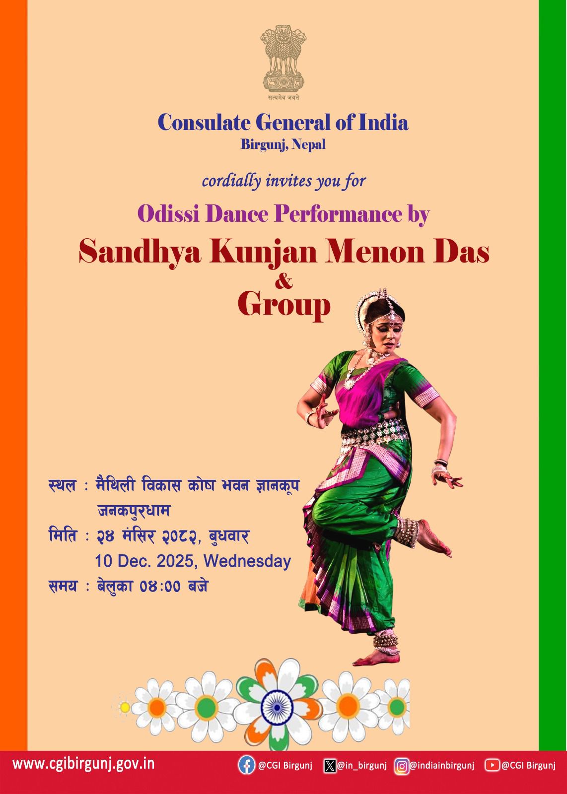 जनकपुरधाम, २३ मंसिर । विरगञ्जस्थित कन्सुलेट जनरल अफ इण्डियाले भोली बुधवार जनकपुरधाममा भव्य ओडिसी नृत्य कार्यक्रम आयोजना गर्ने भएको छ ।