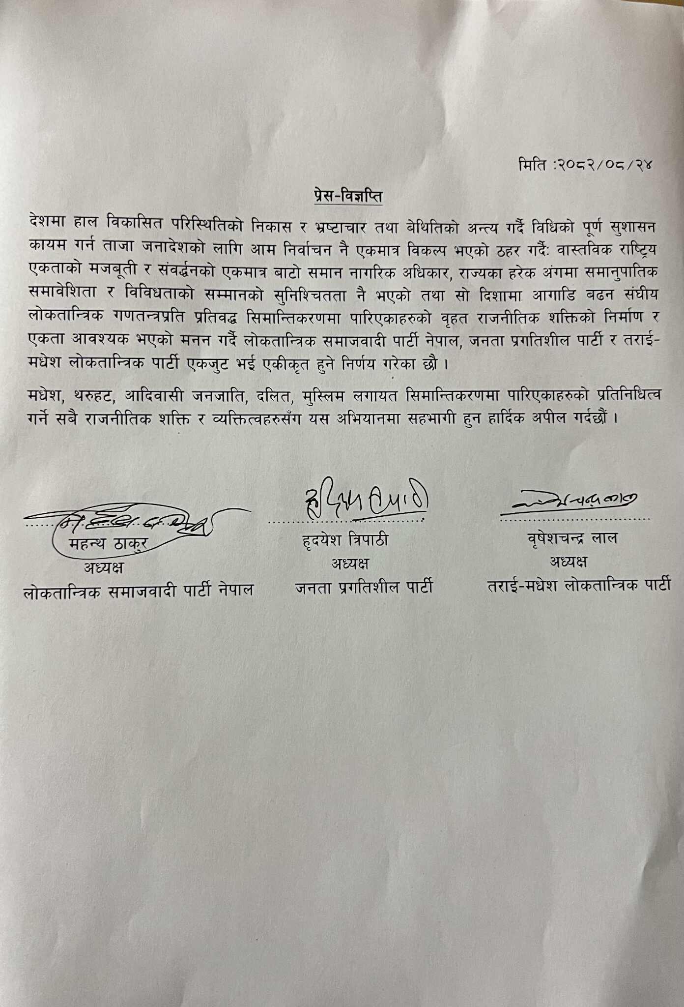तीन दलका अध्यक्षहरू महन्थ ठाकुर, हृदयेश त्रिपाठी र वृषेशचन्द्र लालद्वारा संयुक्त रूपमा जारी गरिएको प्रेस विज्ञप्तिमा देशलाई स्थिरता, सुशासन र समान नागरिक अधिकारसहितको वास्तविक राष्ट्रिय एकताको मार्गमा लैजान ताजा जनादेशसहितको आम निर्वाचन अब अपरिहार्य बनेको उल्लेख छ ।