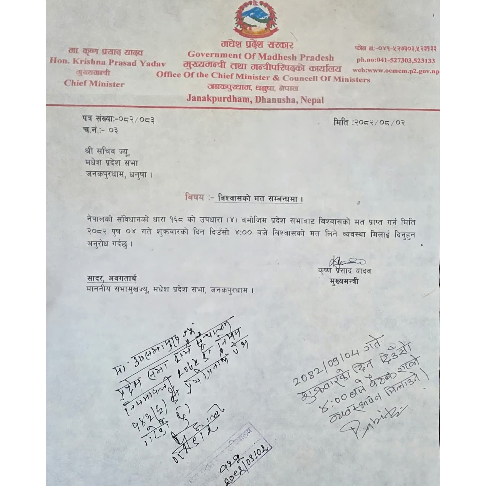 मुख्यमन्त्री यादवले शुक्रबार दिउँसो ४ बजे विश्वासको मत लिने व्यवस्था मिलाइदिन आग्रह गर्दै मधेश प्रदेशसभा सचिवालयलाई पत्राचार गरेका हुन् ।