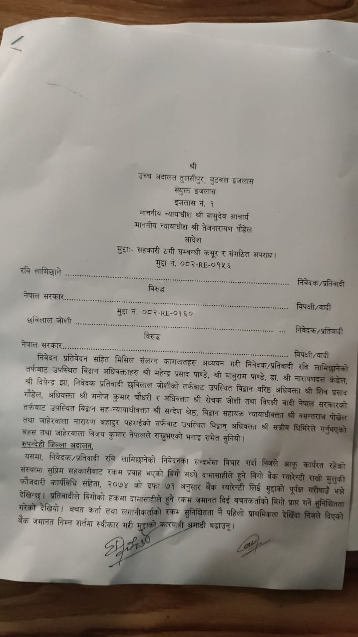 उच्च अदालत बुटवलका सूचना अधिकारी रामबहादुर कुँवरका अनुसार न्यायाधीशद्वय बासुदेव आचार्य र तेजनारायण पौडेलको संयुक्त इजलासले उक्त आदेश दिएको हो । लामिछानेमाथि चलिरहेको मुद्दाको सुनुवाइपछि अदालतले धरौटीमा रिहा गर्ने निर्णय सुनाएको हो ।
