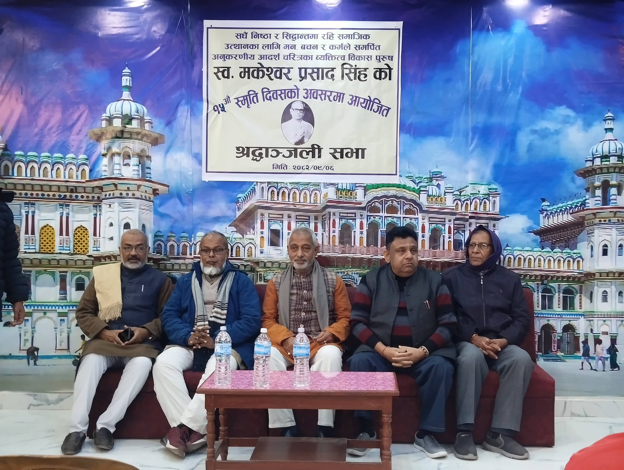 त्यसैगरी, श्रद्धाञ्जली सभामा वक्ताहरूले विकास पुरुष मकेश्वर प्रसाद सिंहले यस भेगको शिक्षा, स्वास्थ्य, सामाजिक जागरण र विकासका क्षेत्रमा पुर्याएको योगदानको विस्तृत चर्चा गरे । मकेश्वर बाबुको नाममा स्थापित संस्थाले समाजसेवामा योगदान पुर्याएका व्यक्तित्वलाई मरणोपरान्तसमेत सम्मान गर्दै आएको कार्यलाई उनीहरूले सकारात्मक र प्रेरणादायी कदमका रूपमा मूल्याङ्कन गरे ।