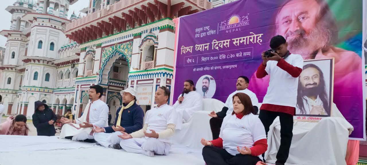जनकपुरधाम, ६ पुष । संयुक्त राष्ट्र संघद्वारा मान्यता प्राप्त विश्व ध्यान दिवसको अवसरमा द आर्ट अफ लिभिङ जनकपुरधामको आयोजनामा जानकी मन्दिरको प्राङ्गणमा विशेष ध्यान कार्यक्रम भव्य रूपमा सम्पन्न भएको छ ।