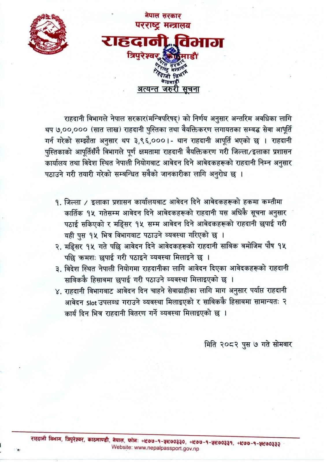 नेपाल सरकार मन्त्रिपरिषद्को निर्णयअनुसार अन्तरिम अवधिका लागि थप ७ लाख राहदानी पुस्तिका तथा वैयक्तिकरणसम्बन्धी सेवा आपूर्तिका लागि गरिएको सम्झौताअन्तर्गत उक्त संख्याको राहदानी प्राप्त भएको विभागले जानकारी दिएको हो ।