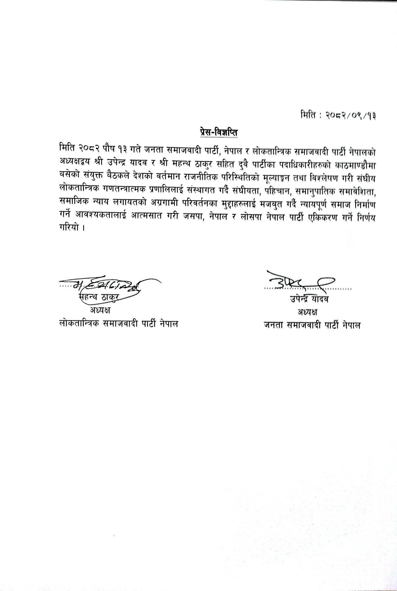 जनकपुरधाम, १३ पुष । जनता समाजवादी पार्टी (जसपा) नेपाल र लोकतान्त्रिक समाजवादी पार्टी (लोसपा) नेपालबीच एकीकरण गर्ने निर्णय भएको छ ।