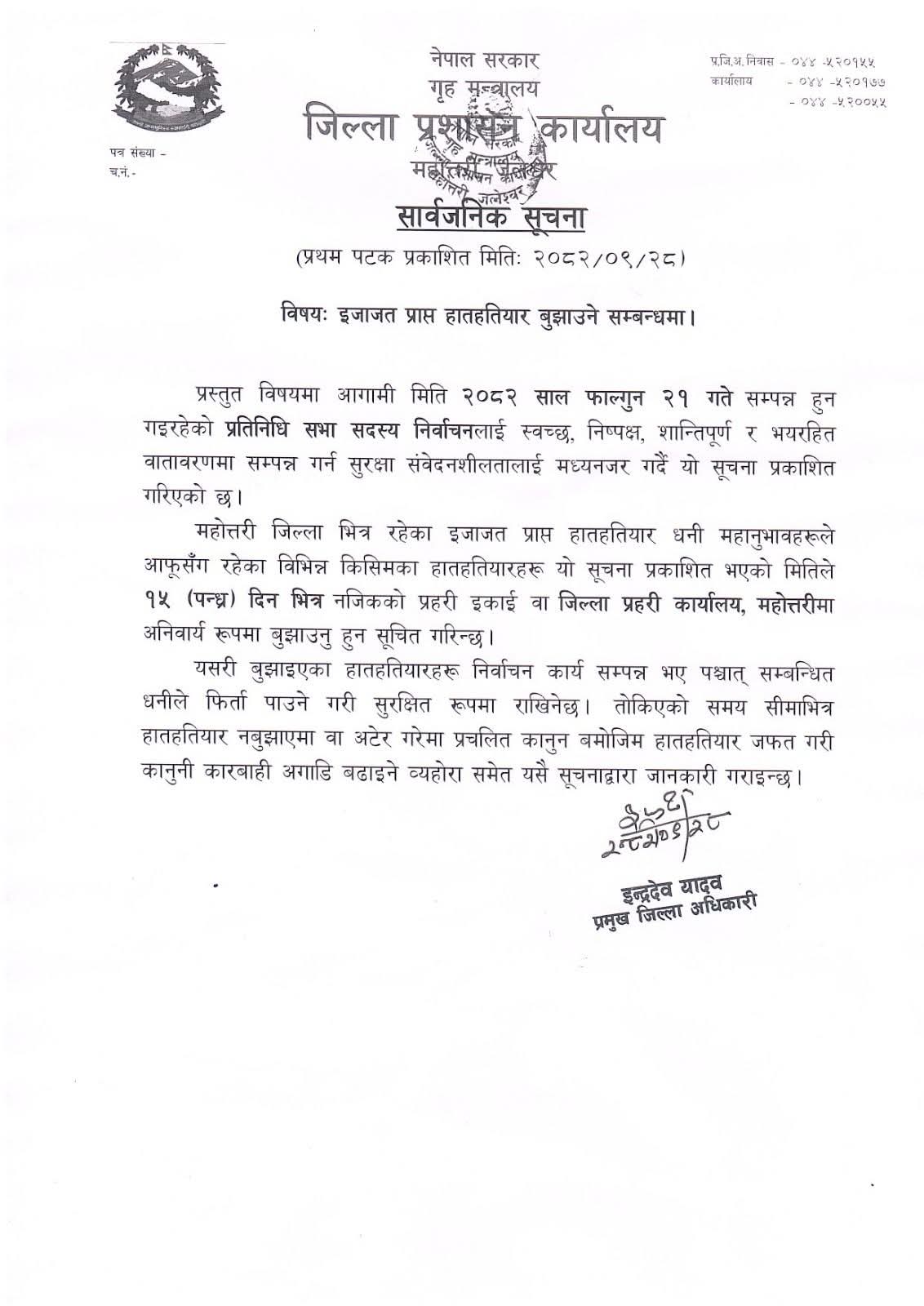 जिल्ला प्रशासन कार्यालय महोत्तरीले सार्वजनिक सूचना जारी गर्दै जिल्लाभित्र रहेका इजाजत प्राप्त हातहतियार धनीहरूलाई सूचना प्रकाशित भएको मितिले १५ दिनभित्र नजिकको प्रहरी इकाइ वा जिल्ला प्रहरी कार्यालय महोत्तरीमा हातहतियार बुझाउन आग्रह गरेको हो ।