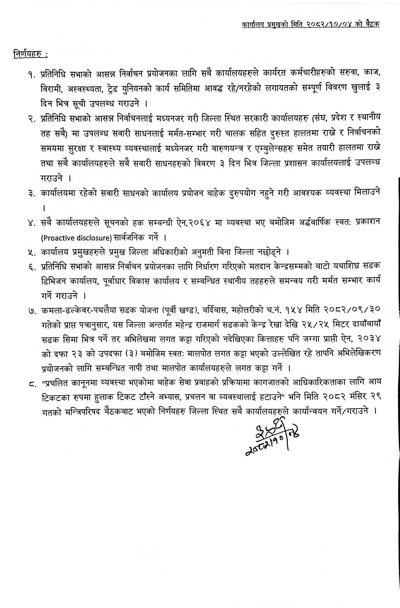 कार्यालय प्रमुखहरूको आज सम्पन्न बैठकले निर्वाचनलाई निष्पक्ष, सुरक्षित र व्यवस्थित बनाउन आठ बुँदे निर्णय गरेको हो ।