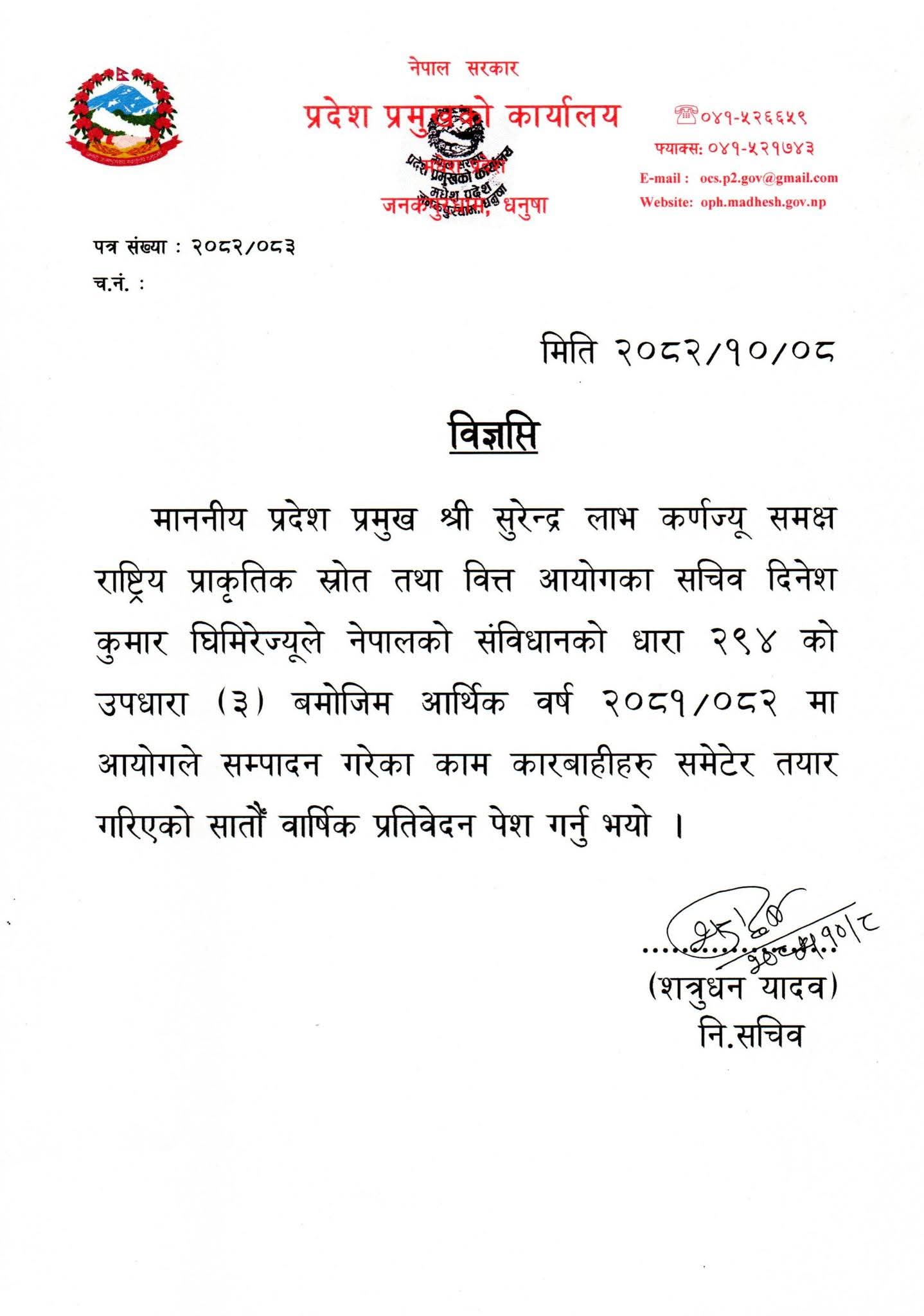 जनकपुरधाम, ८ माघ । राष्ट्रिय प्राकृतिक स्रोत तथा वित्त आयोगका सचिव दिनेश कुमार घिमिरेले प्रदेश प्रमुख सुरेन्द्र लाभ कर्णसमक्ष आयोगको सातौँ वार्षिक प्रतिवेदन पेश गरेका छन् ।