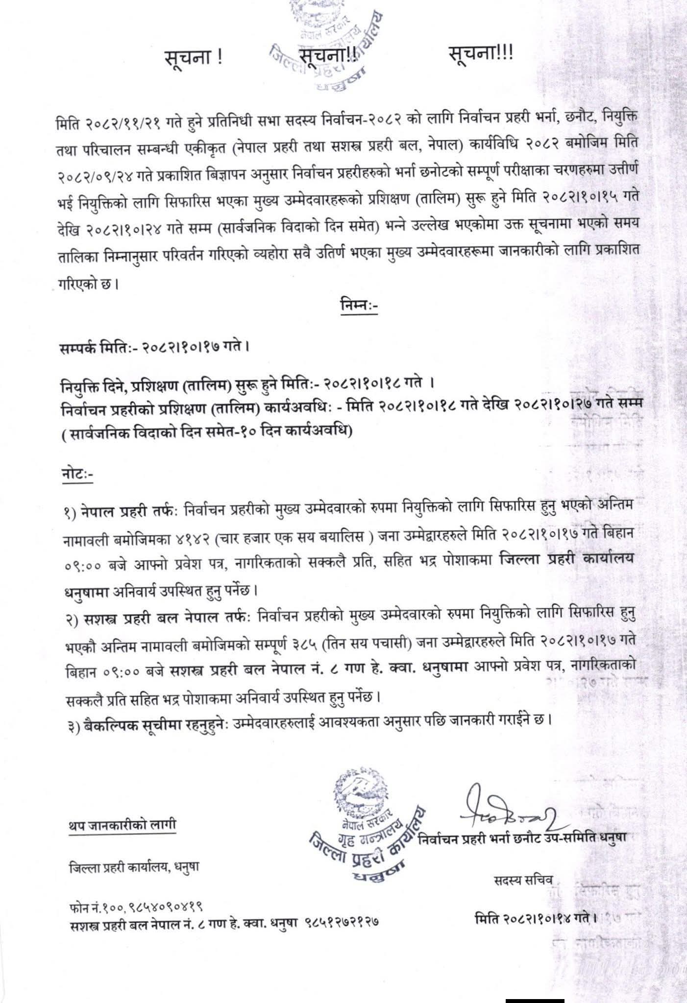 नेपाल प्रहरी तथा सशस्त्र प्रहरी बल नेपालका लागि भर्ना, छनोट, नियुक्ति तथा परिचालनसम्बन्धी एकीकृत कार्यविधि २०८२ अनुसार छनोट भई नियुक्तिका लागि सिफारिस भएका मुख्य उम्मेदवारहरूको प्रशिक्षण कार्यक्रम संशोधन गरिएको जिल्ला प्रहरी कार्यालय धनुषाले जनाएको छ ।
