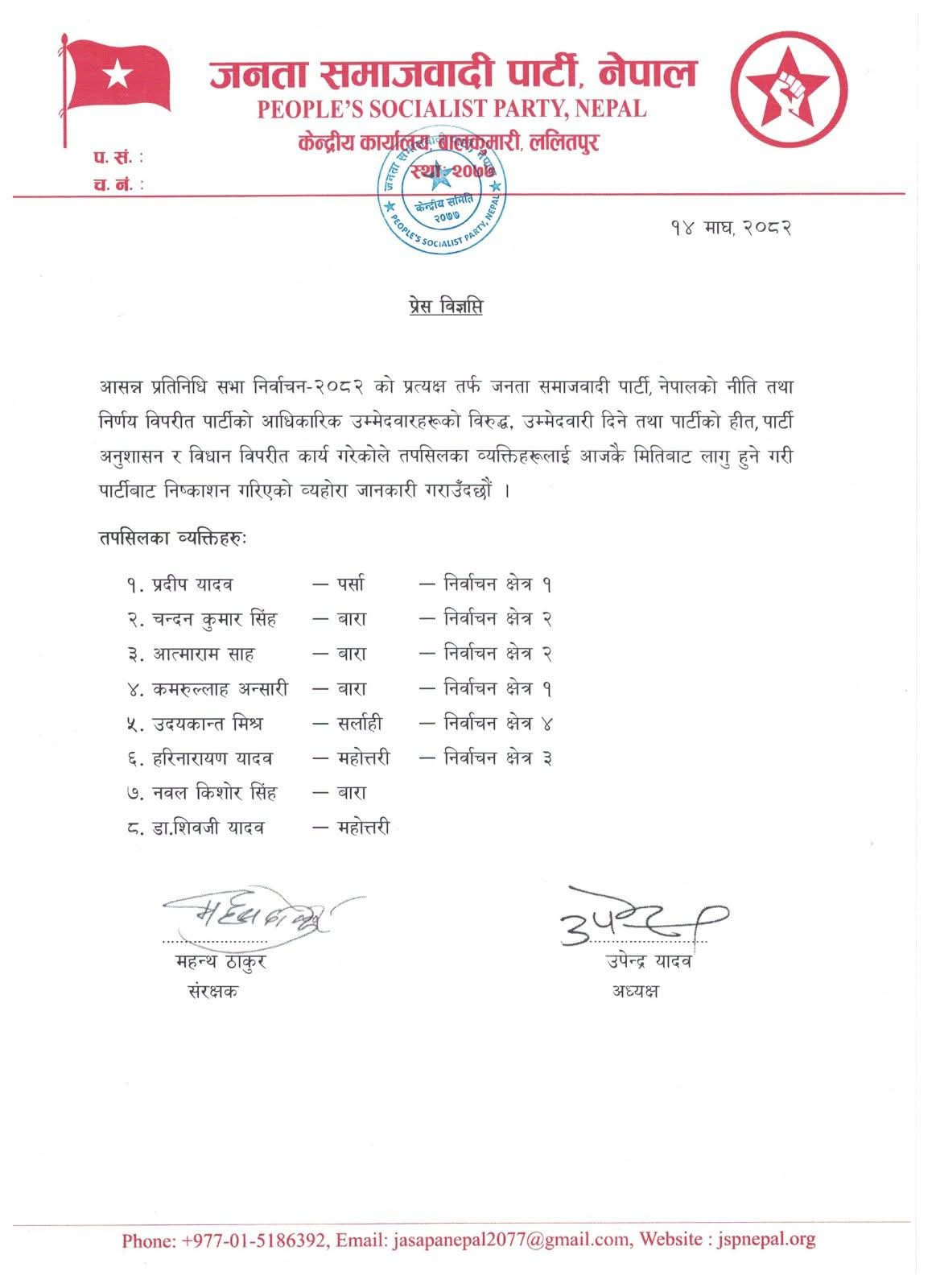 जनकपुरधाम, १४ माघ । जनता समाजवादी पार्टी नेपाल (जसपा) ले आसन्न प्रतिनिधिसभा निर्वाचन–२०८२ मा पार्टीको आधिकारिक उम्मेदवारविरुद्ध उम्मेदवारी दिएको आरोपमा आठ जना नेतालाई पार्टीबाट निष्कासन गरेको छ ।