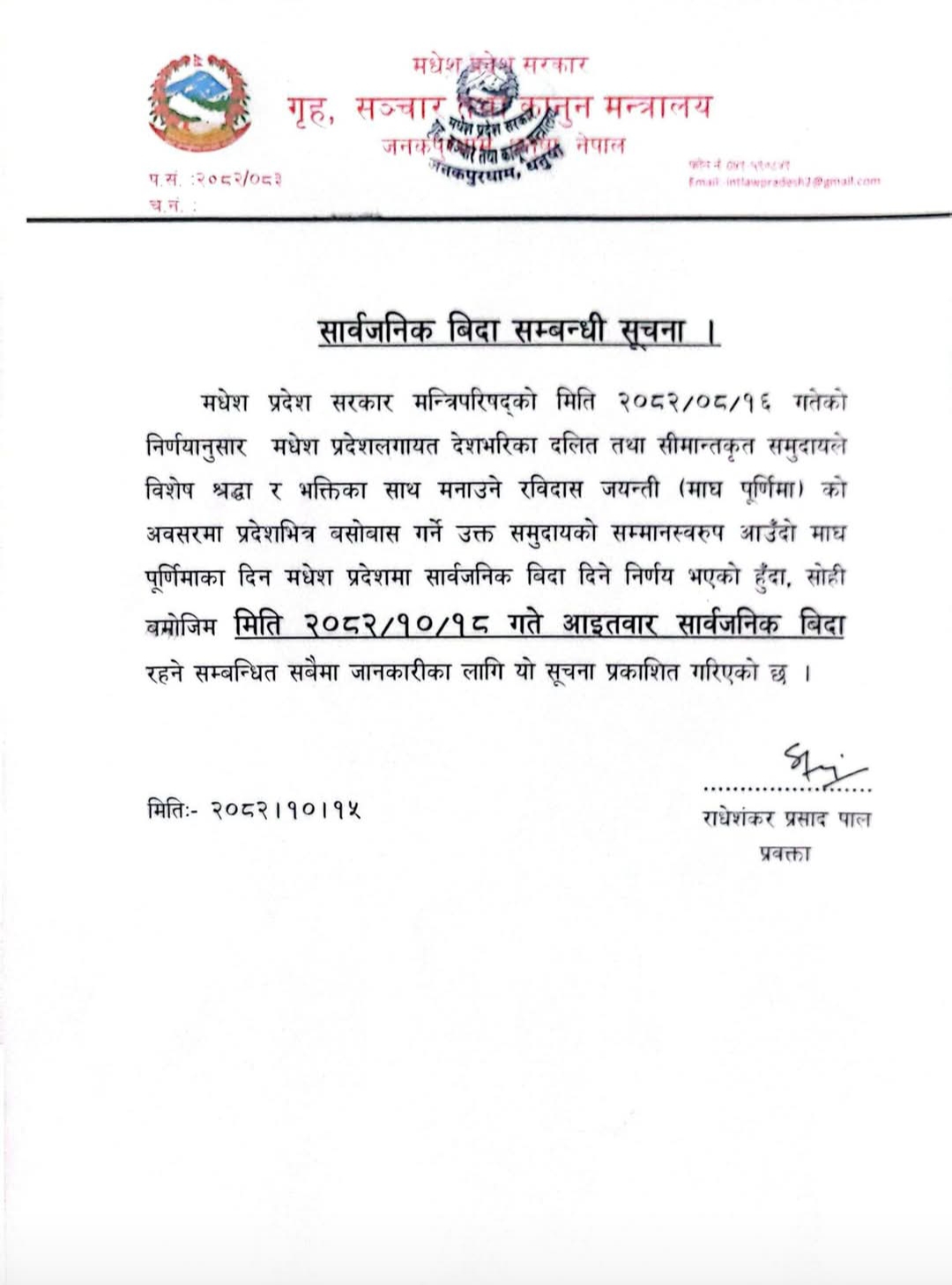 जनकपुरधाम, १५ माघ । मधेश प्रदेश सरकार मन्त्रिपरिषद्को निर्णयअनुसार रविदास जयन्तीको अवसरमा प्रदेशभर सार्वजनिक बिदा दिइने भएको छ ।