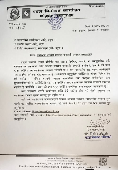 निर्वाचन कार्यालयले धनुषा जिल्लाभित्रका सबै संघीय कार्यालय, स्थानीय तह तथा वित्तीय संस्थालाई नामावली कार्यालय परिसरमा सबैले देख्ने स्थानमा टाँस गर्न निर्देशन दिएको छ । साथै टाँस गरिएको विवरणको मुचुल्का अनिवार्य रूपमा प्रदेश निर्वाचन कार्यालयमा पठाउनुपर्ने व्यवस्था गरिएको छ ।
