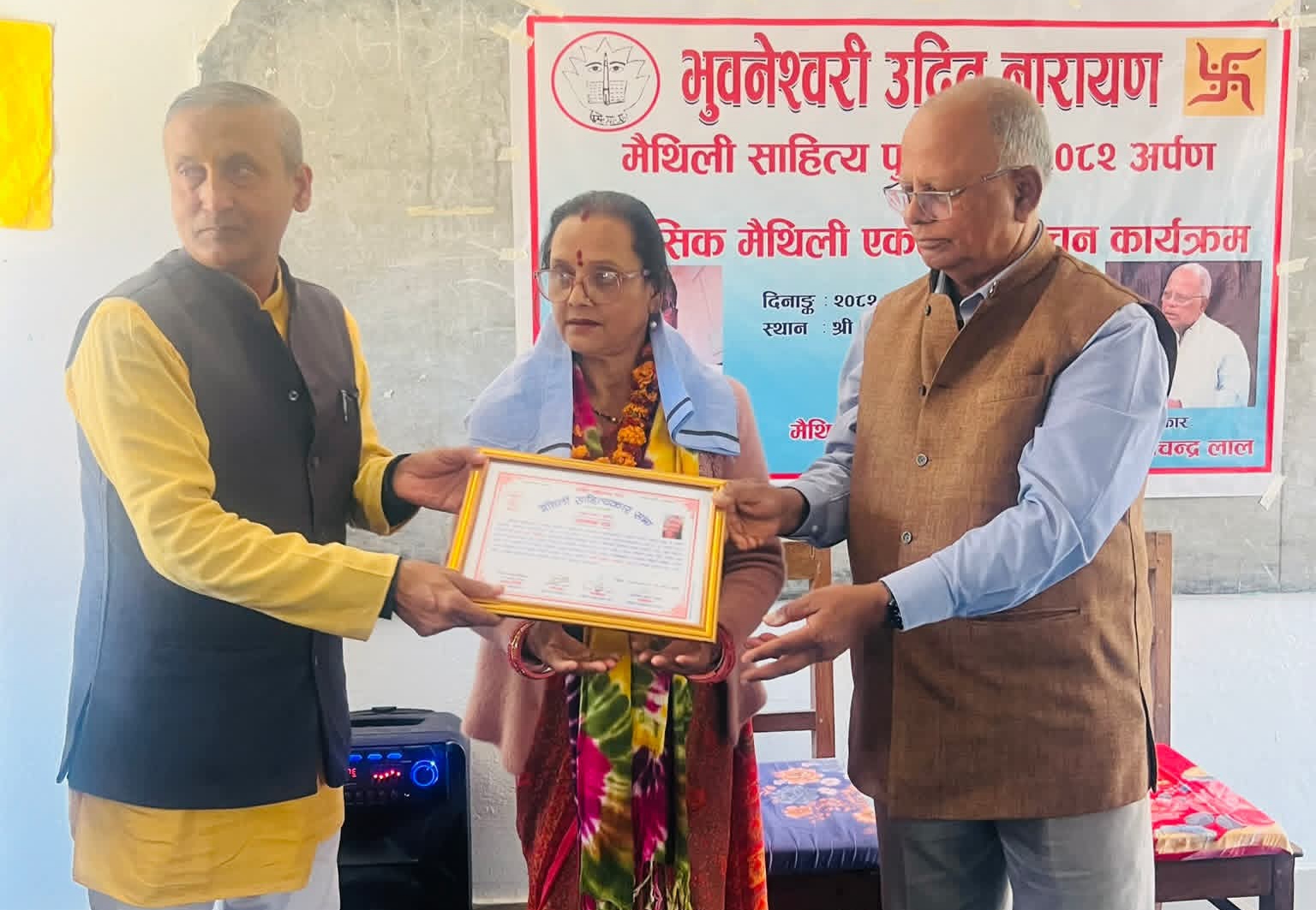 कार्यक्रममा प्रतिष्ठित गीतकार तथा साहित्यकार अशोक दत्तलाई ‘भुवनेश्वरी उदितनारायण मैथिली साहित्य पुरस्कार–२०८२’ अर्पण गरियो ।