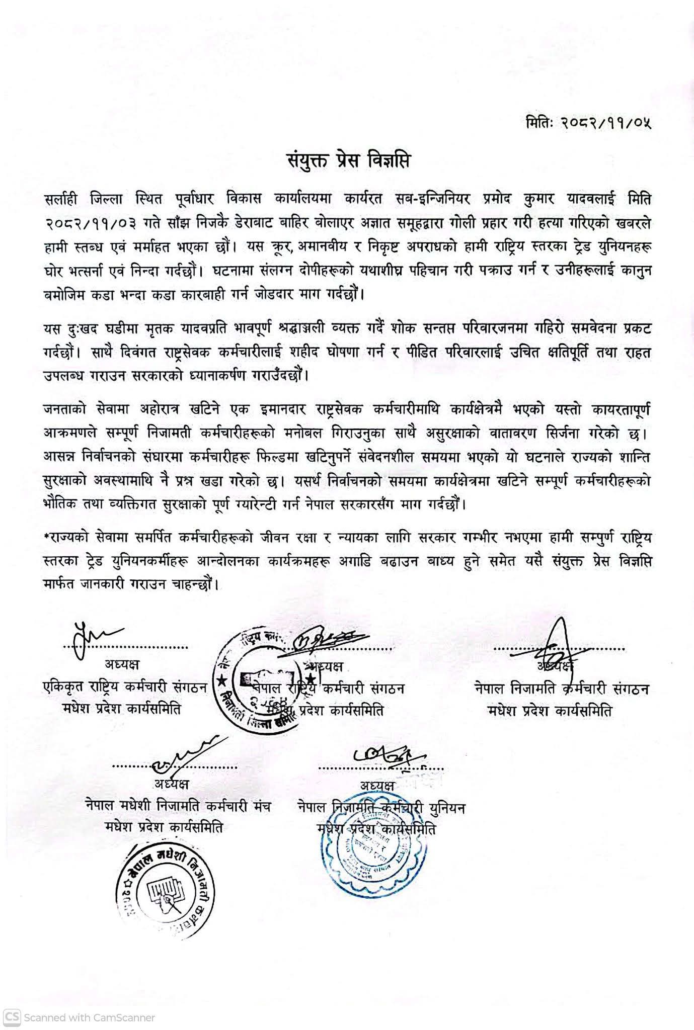 जनकपुरधाम, ५ फागुन । सर्लाहीस्थित पूर्वाधार विकास कार्यालयमा कार्यरत सब–इन्जिनियर प्रमोद कुमार यादवको गोली प्रहार गरी हत्या गरिएको घटनाप्रति विभिन्न राष्ट्रिय स्तरका ट्रेड युनियनहरूले घोर निन्दा र भर्त्सना गरेका छन् ।
