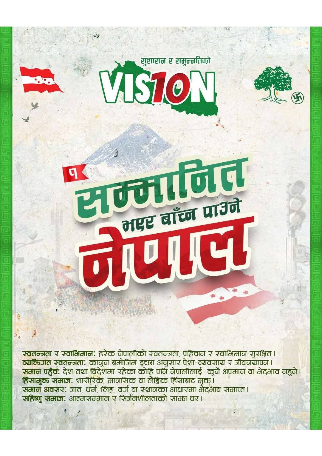 सभापति गगन थापाका अनुसार कांग्रेसको भिजनले हरेक नागरिकको आत्मसम्मानलाई पहिलो प्राथमिकतामा राख्नेछ । जात, धर्म, लिङ्ग वा क्षेत्रको आधारमा हुने विभेद अन्त्य गर्दै नागरिकले शिर ठाडो राखेर बाँच्न पाउने ‘सम्मानित नेपाल’ निर्माण गर्ने योजना छ ।
