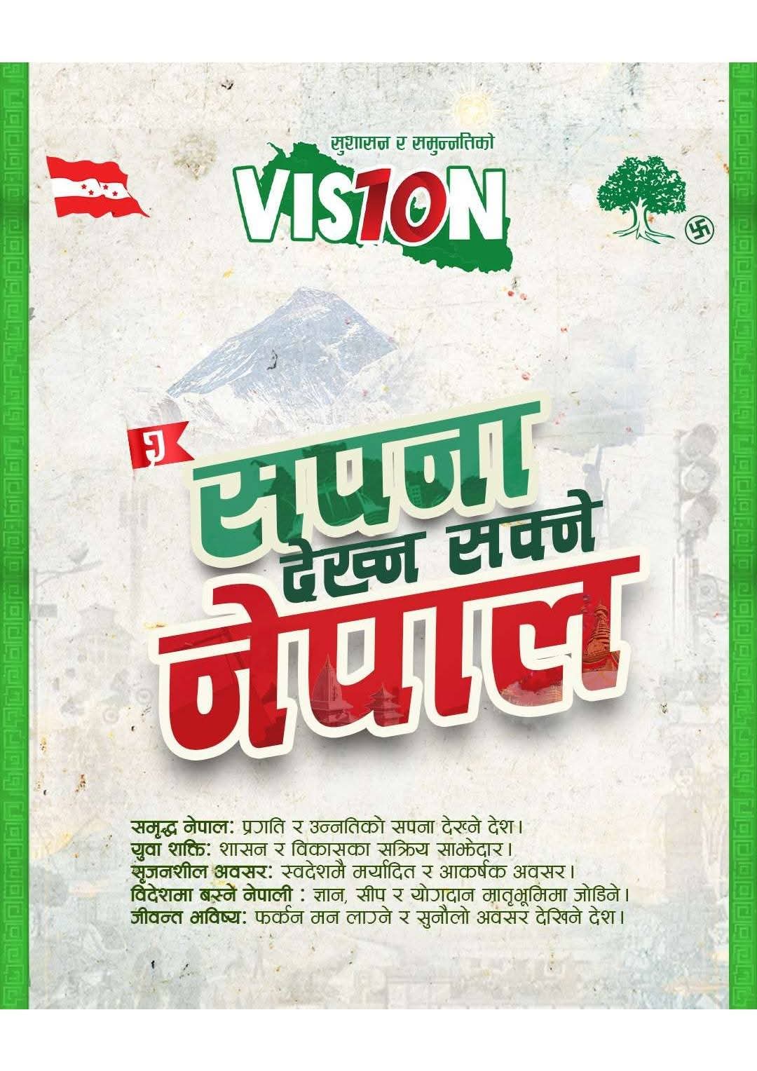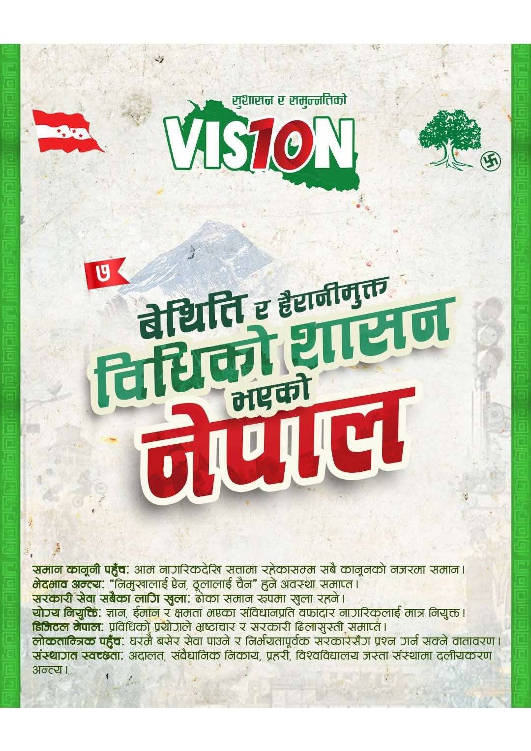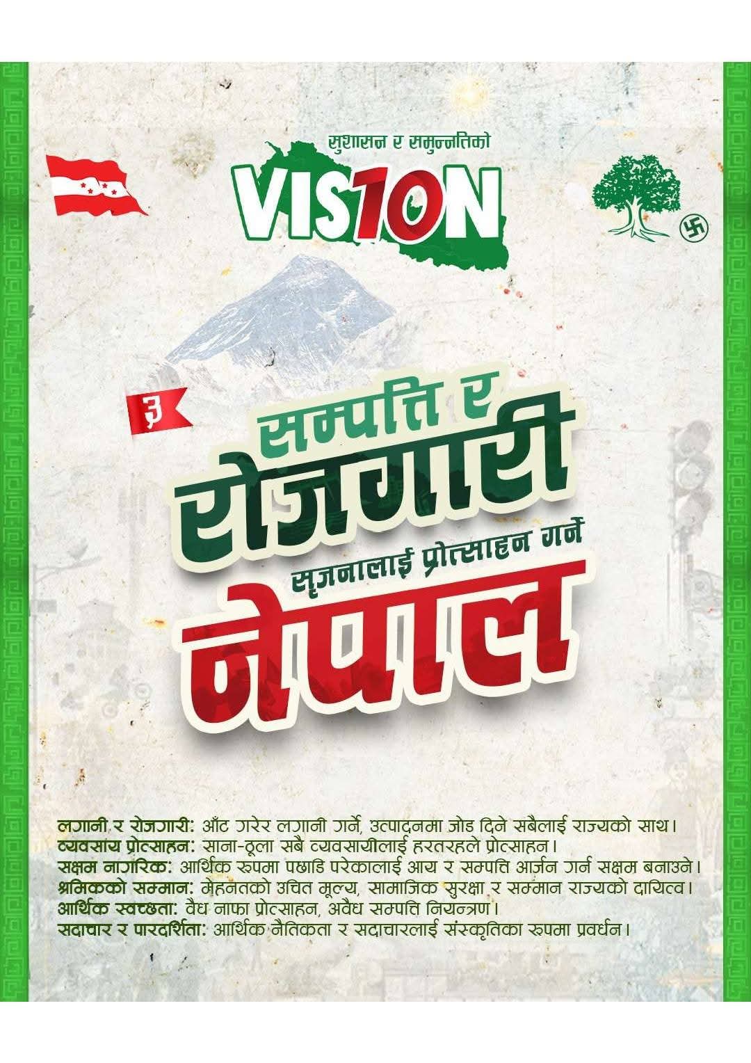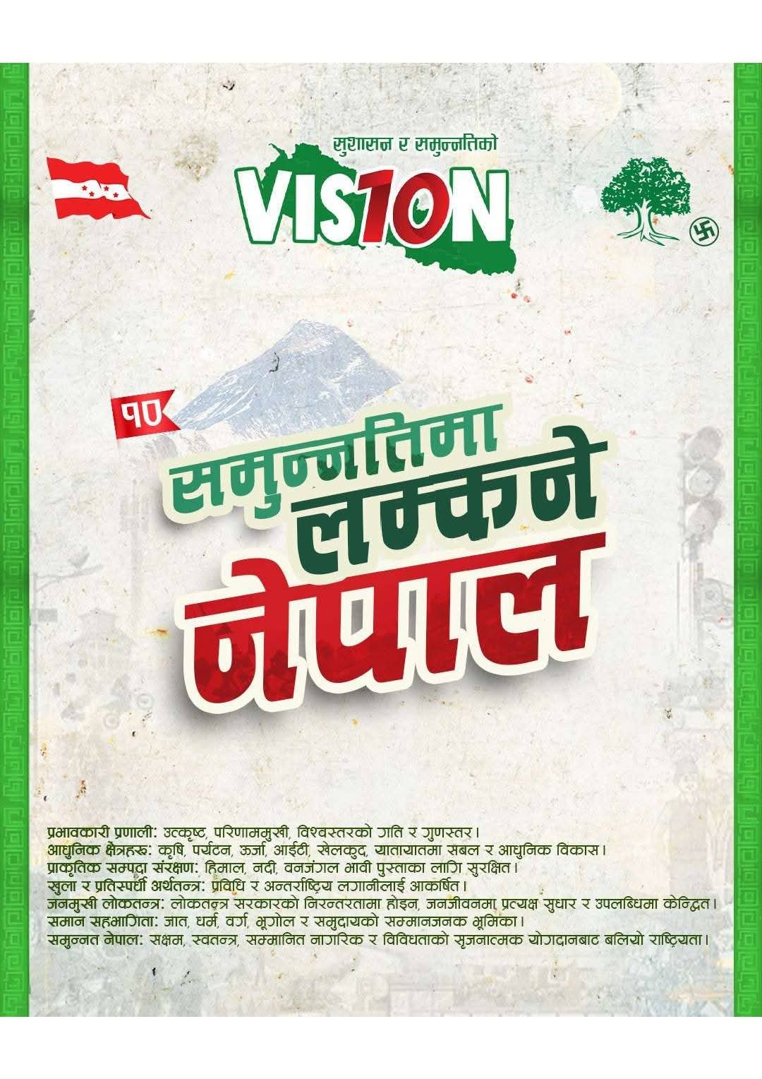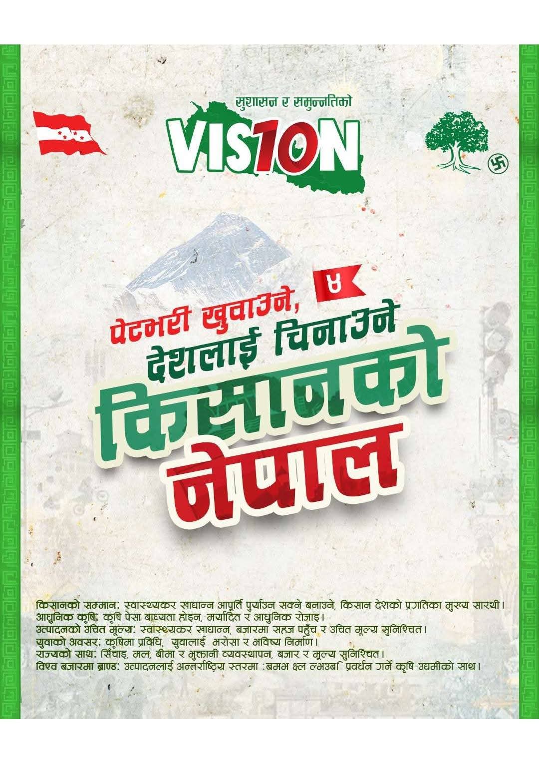 कृषिलाई मर्यादित पेशा बनाउन प्रविधि र बजार व्यवस्थापनको योजना अघि राखिएको छ । पर्यटन, ऊर्जा र पूर्वाधारको विकासमार्फत समृद्धिको बाटोमा नेपाल अघि बढ्ने चित्र पनि यसमा समेटिएको छ ।