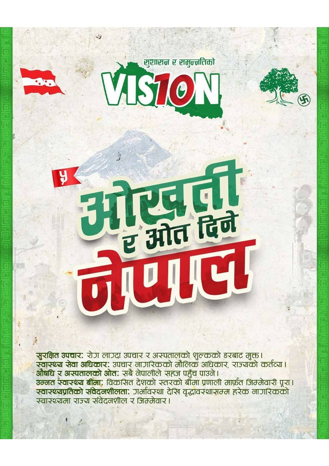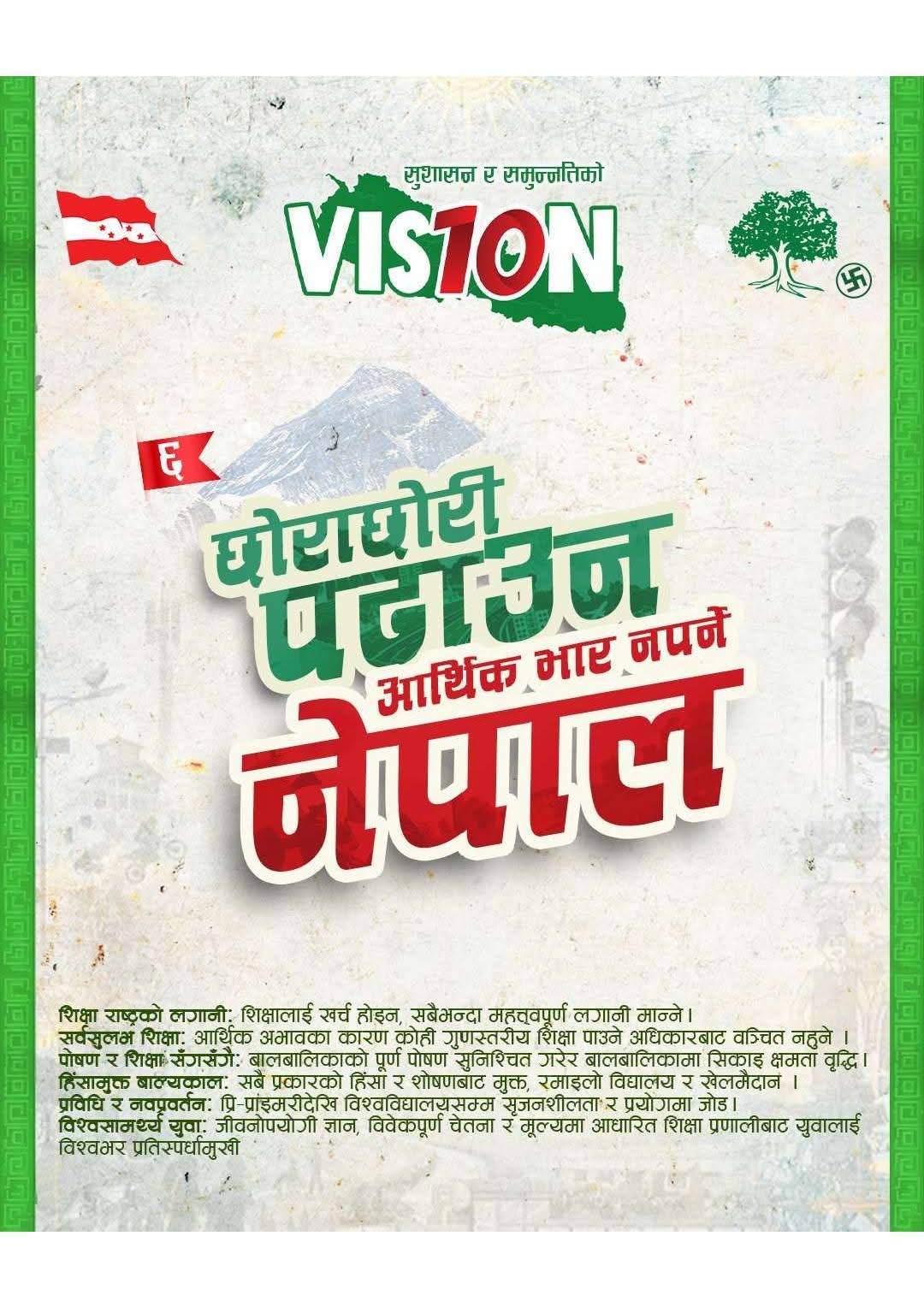 शिक्षा र स्वास्थ्य क्षेत्रलाई प्राथमिकता दिँदै गुणस्तरीय शिक्षा र स्वास्थ्य बीमा प्रणाली लागू गरिने प्रतिवद्धता जनाइएको छ । अभिभावकमा आर्थिक भार नपरी गुणस्तरीय शिक्षा उपलब्ध गराउने र प्रतिस्पर्धी जनशक्ति उत्पादन गर्ने लक्ष्य पनि भिजनमा रहेको छ ।