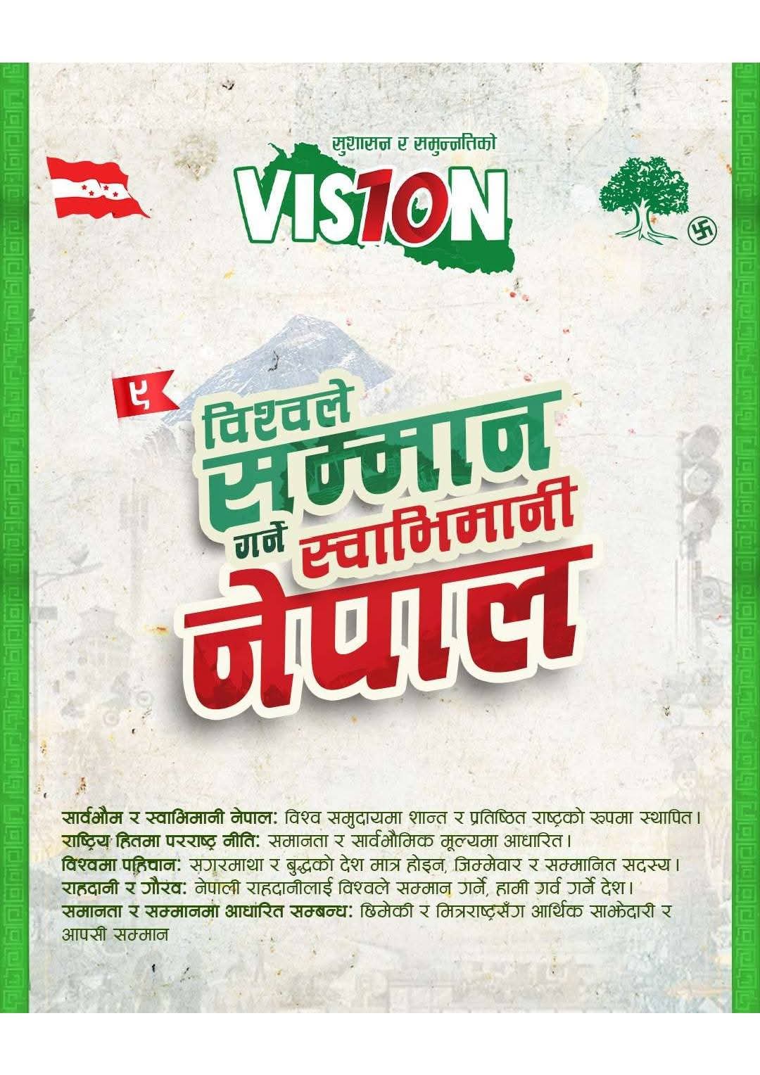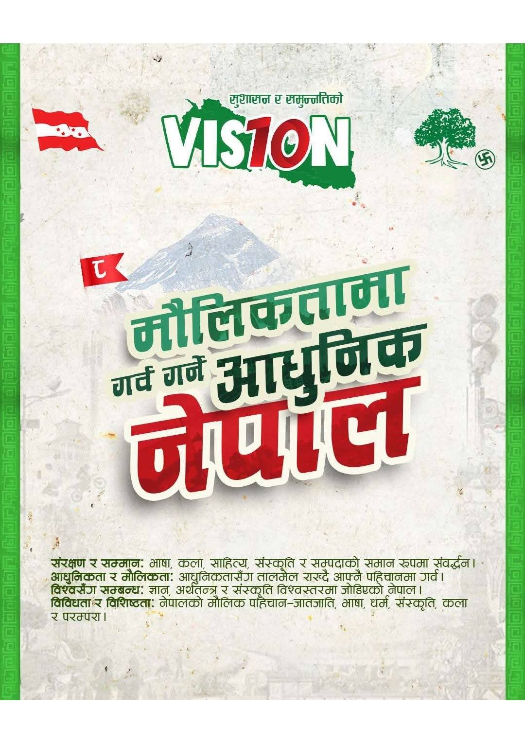 पार्टीले नेपालका मौलिक भाषा, संस्कृति, विविधता र सम्पदामा गर्व गर्दै आधुनिकता अपनाउने र अन्तर्राष्ट्रिय मञ्चमा नेपालको स्वाभिमान उच्च राख्ने विदेश नीति अवलम्बन गर्ने योजना पनि प्रस्तुत गरेको छ ।