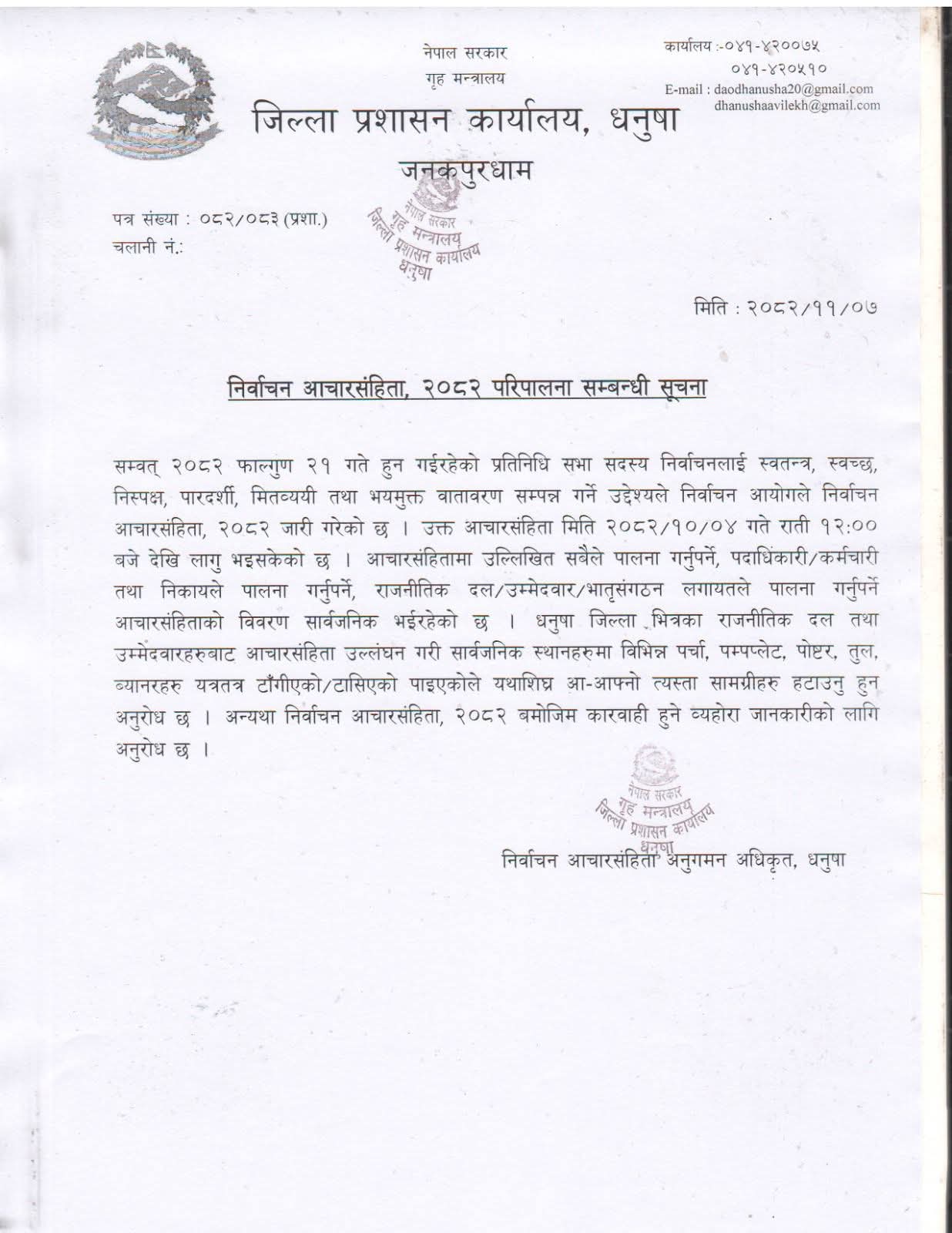 जिल्ला प्रशासन कार्यालय धनुषाले सूचना जारी गर्दै सार्वजनिक स्थानमा टाँसिएका चुनावी सामग्री तत्काल हटाउन राजनीतिक दल र उम्मेदवारलाई निर्देशन दिएको हो ।