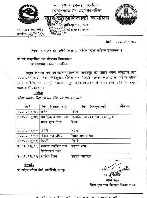 जनकपुरधाम उपमहानगरद्वारा कक्षा ८ को वार्षिक परीक्षा तालिका सार्वजनिक