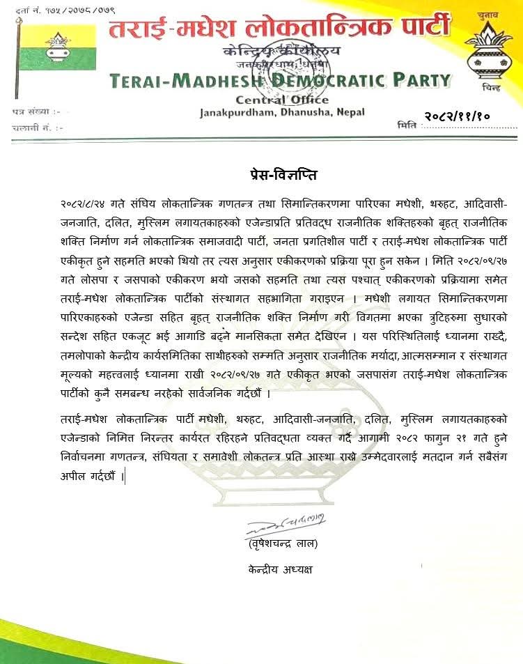 जनकपुरधाम, १० फागुन । तराई–मधेश लोकतान्त्रिक पार्टी (तमलोप) ले जनता समाजवादी पार्टी (जसपा) सँग आफ्नो कुनै सम्बन्ध नरहेको औपचारिक घोषणा गरेको छ ।