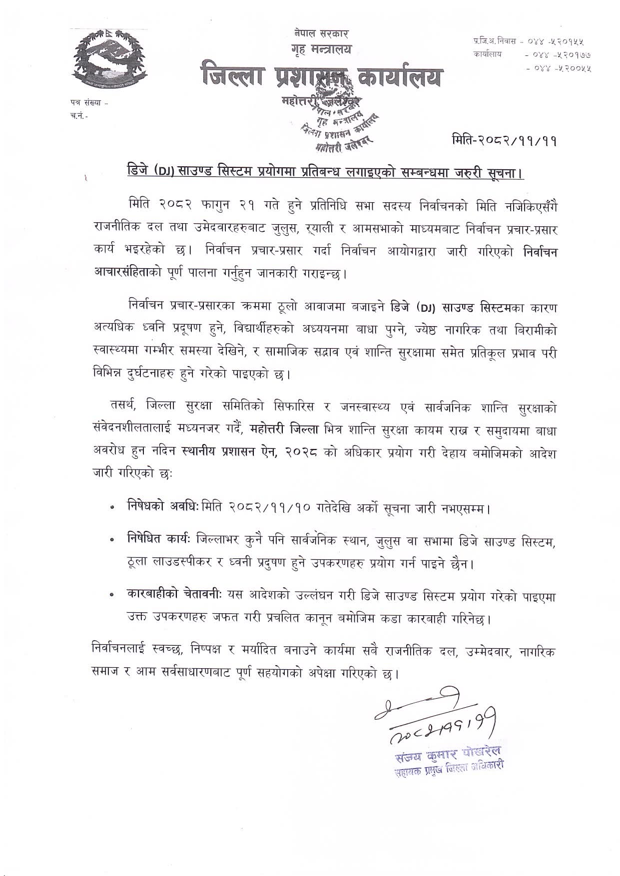 आदेश उल्लंघन गरी डिजे साउण्ड सिस्टम प्रयोग गरेको पाइएमा सम्बन्धित उपकरण जफत गरिने र प्रचलित कानूनअनुसार कडा कारबाही गरिने चेतावनी समेत प्रशासनले दिएको छ ।