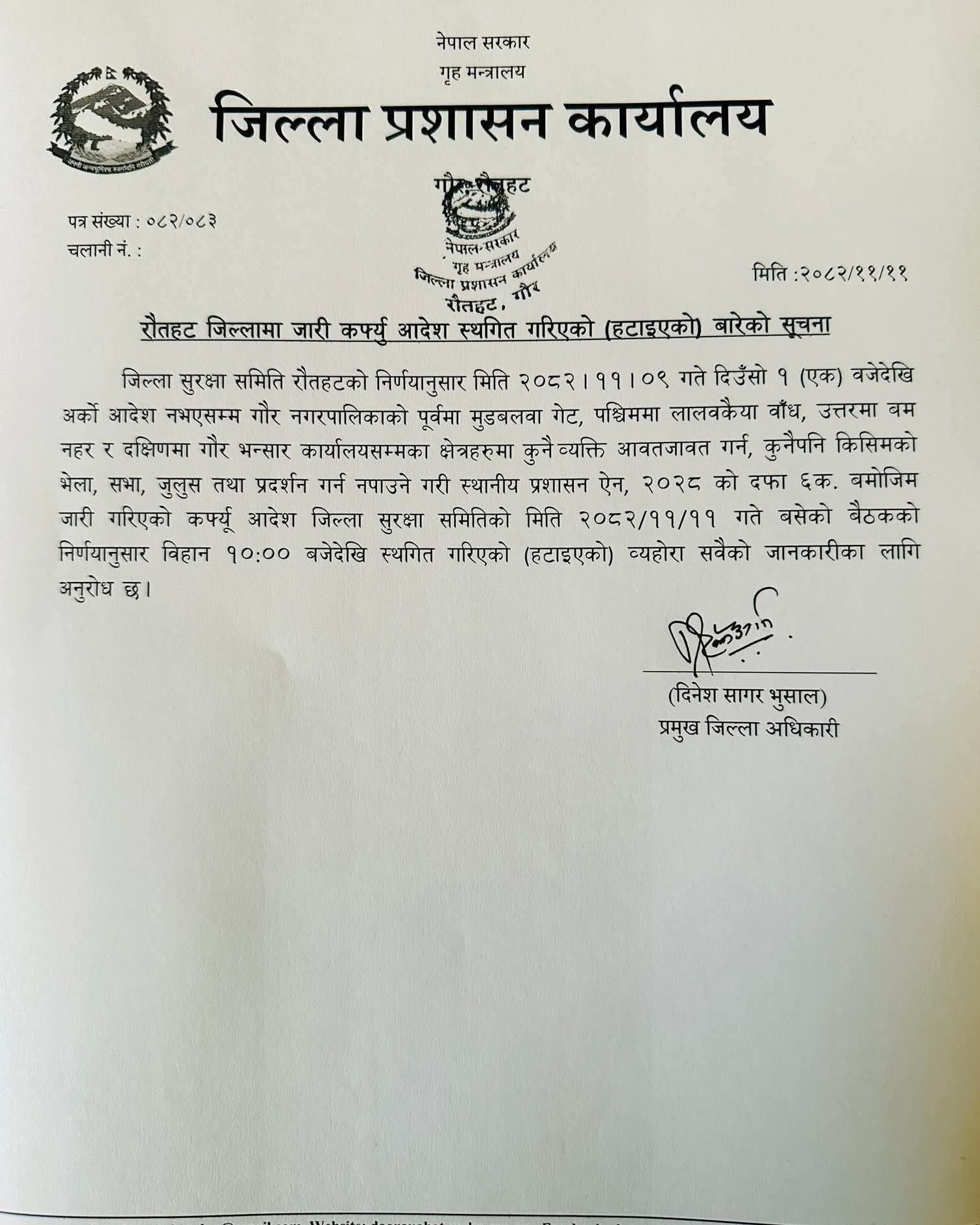 रौतहट, ११ फागुन । गौरमा लगाइएको अनिश्चितकालीन कर्फ्यू आदेश सोमबार बिहानदेखि हटाइएको छ ।