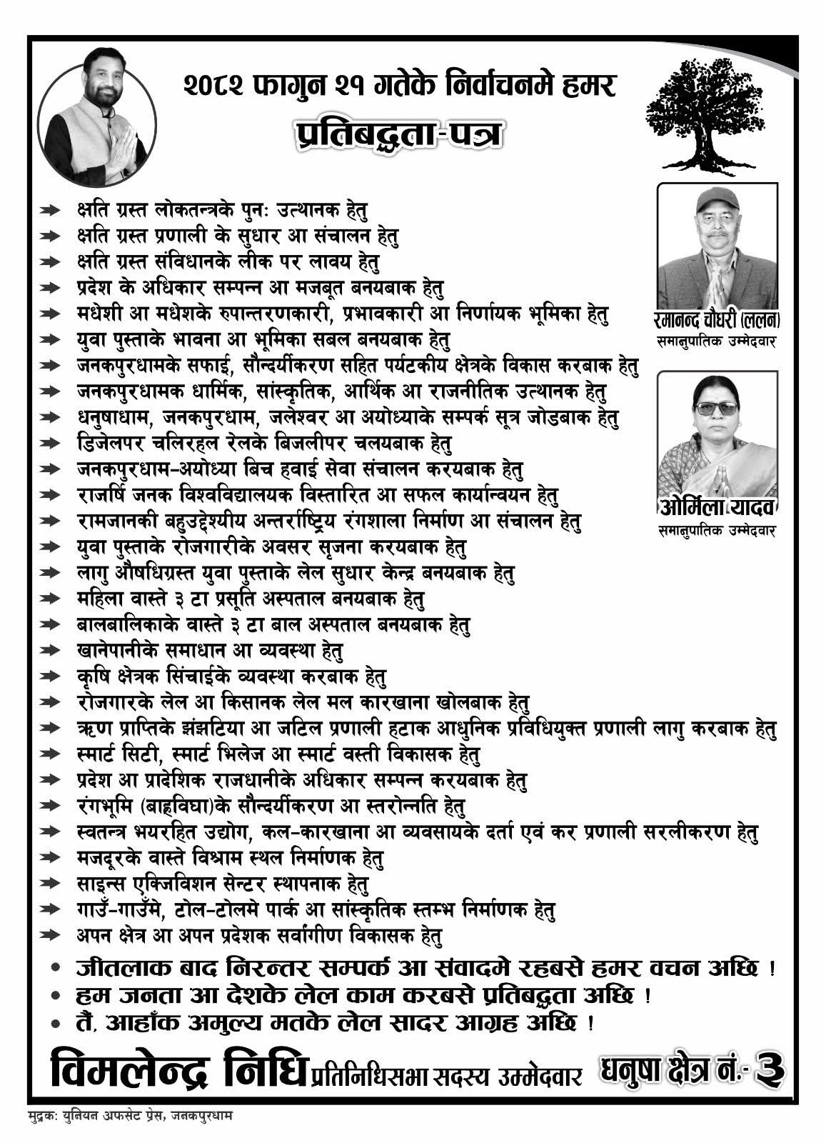 जनकपुरधाम, ११ फागुन । प्रतिनिधिसभा निर्वाचन लक्षित गर्दै धनुषा क्षेत्र नम्बर–३ का उम्मेदवार विमलेन्द्र निधिले लोकतन्त्रको पुनःउत्थान, प्रदेश सुदृढीकरण र जनकपुरधाम केन्द्रित विकासलाई प्राथमिकतामा राख्दै आफ्नो प्रतिबद्धता सार्वजनिक गरेका छन् ।