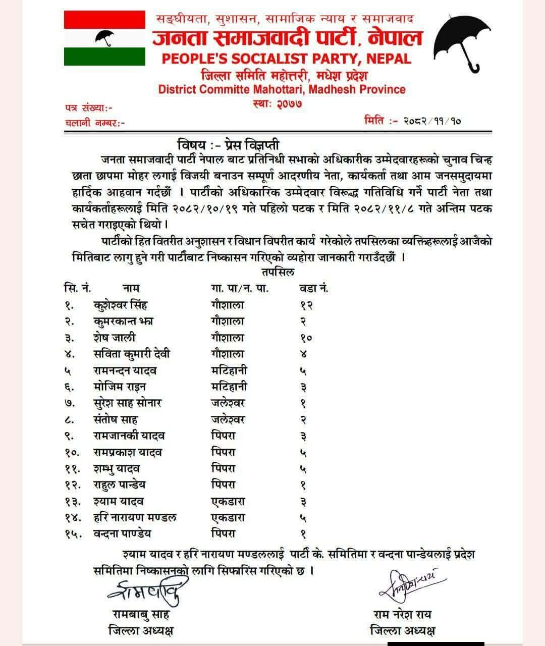 पार्टीका जिल्ला अध्यक्ष रामबाबु साह र रामनरेश रायले जारी गरेको विज्ञप्तिमा पार्टीको अनुशासन, विधान र हितको रक्षा गर्दै आगामी निर्वाचनमा सबैले पार्टी उम्मेदवारको समर्थन गर्नुपर्ने उल्लेख छ ।