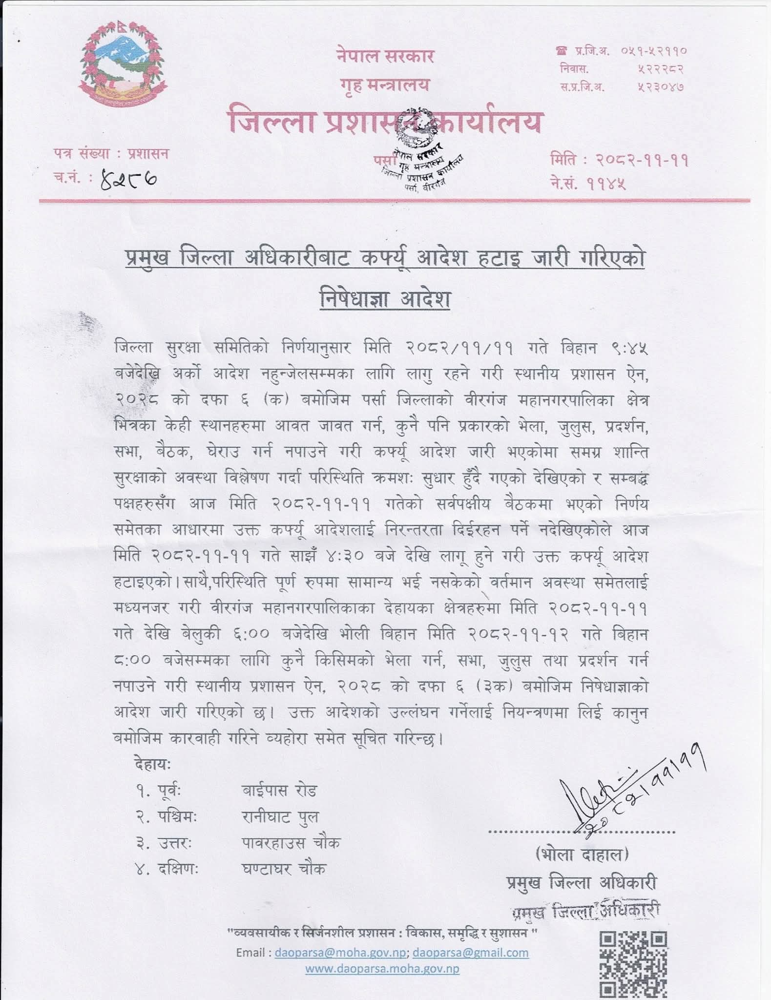 वीरगञ्जमा कर्फ्यू हट्यो, निषेधाज्ञा जारी