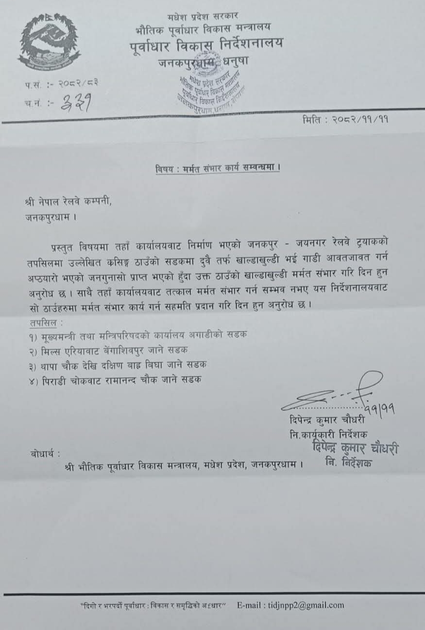 निर्देशनालयले पत्र पठाउँदै जनकपुर–जयनगर रेल्वे ट्र्याकको विभिन्न क्रसिङ क्षेत्रमा सडक बिग्रिएको र सवारी आवतजावतमा समस्या भएको भन्दै जनगुनासो बढेको उल्लेख गरेको छ ।