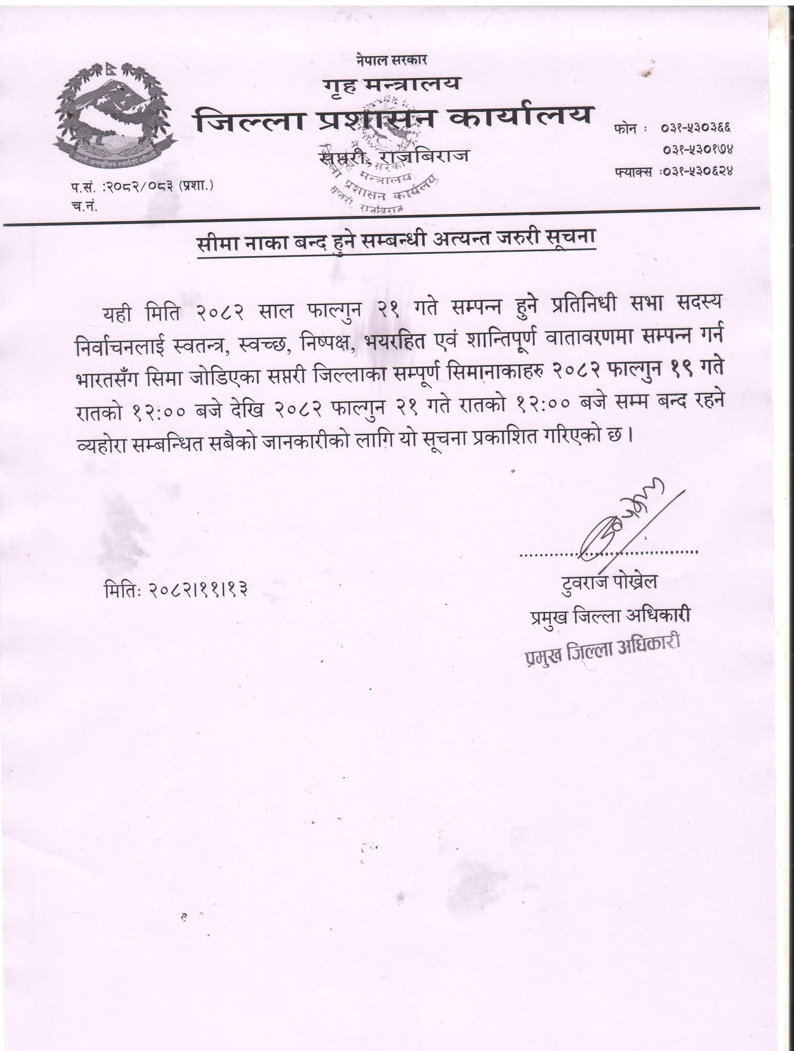 प्रमुख जिल्ला अधिकारी टुवराज पोख्रेलले जारी गरेका दुवै सूचनामार्फत निर्वाचनलाई मर्यादित बनाउन नागरिकको सहयोग आवश्यक रहेको उल्लेख गर्दै चाडपर्व र निर्वाचन दुवै शान्तिपूर्ण रूपमा सम्पन्न गर्न सबै पक्षसँग सहकार्यको अपिल गरेका छन् ।