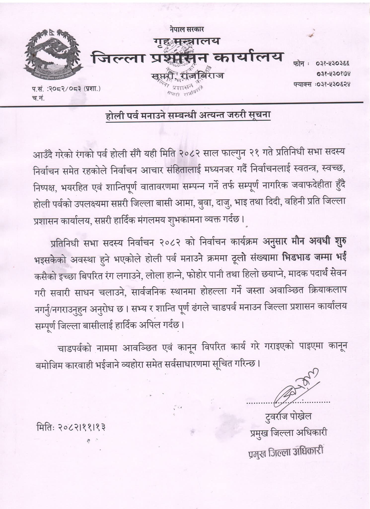 जिल्ला प्रशासन कार्यालय सप्तरीले जारी गरेको सूचनामा होली पर्व र निर्वाचन एकै समयमा परेकाले आचारसंहितालाई मध्यनजर गर्दै चाडपर्व सभ्य र शान्तिपूर्ण ढंगले मनाउन जिल्लावासीसँग अपिल गरिएको छ ।