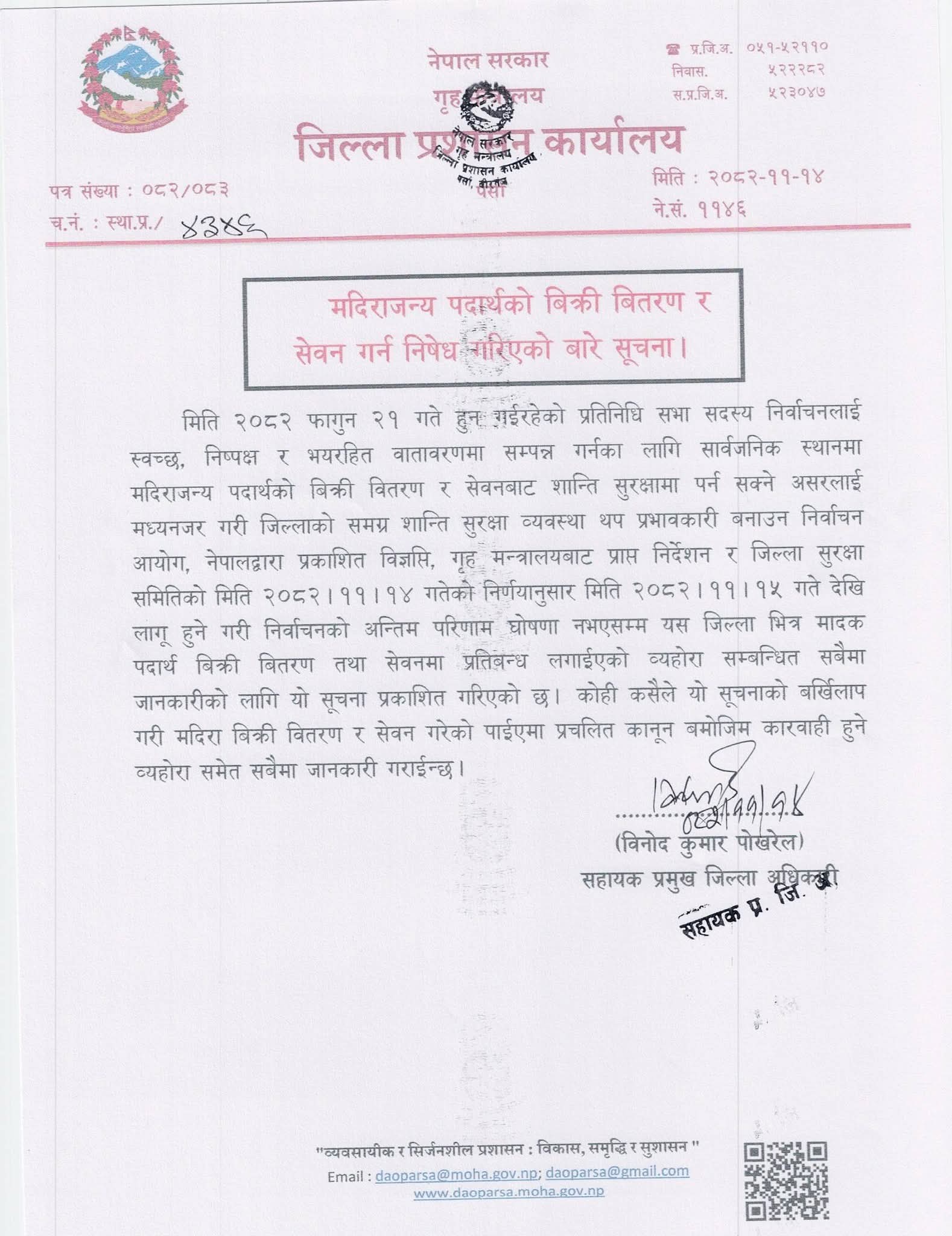 जिल्ला प्रशासन कार्यालय पर्साले जारी गरेको सूचनाअनुसार फागुन १५ गते शुक्रबारदेखि निर्वाचनको अन्तिम परिणाम घोषणा नभएसम्म जिल्लाभित्र मादक पदार्थको बिक्री, वितरण र सेवनमा रोक लगाइएको हो ।