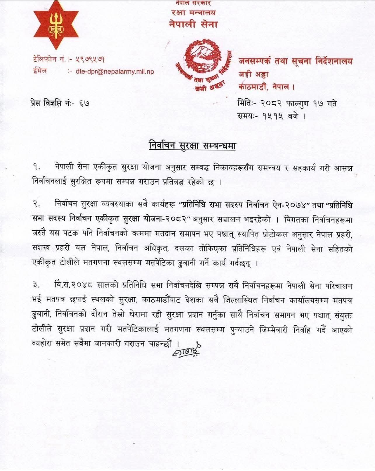 रक्षा मन्त्रालय अन्तर्गतको जनसम्पर्क तथा सूचना निर्देशनालय, जङ्गी अड्डाले आइतबार दिउँसो जारी गरेको प्रेस विज्ञप्तिमा एकीकृत सुरक्षा योजना अनुसार सम्बद्ध निकायहरूसँग समन्वय र सहकार्य गर्दै निर्वाचन सुरक्षाका सम्पूर्ण कार्य सञ्चालन भइरहेको उल्लेख गरिएको छ ।
