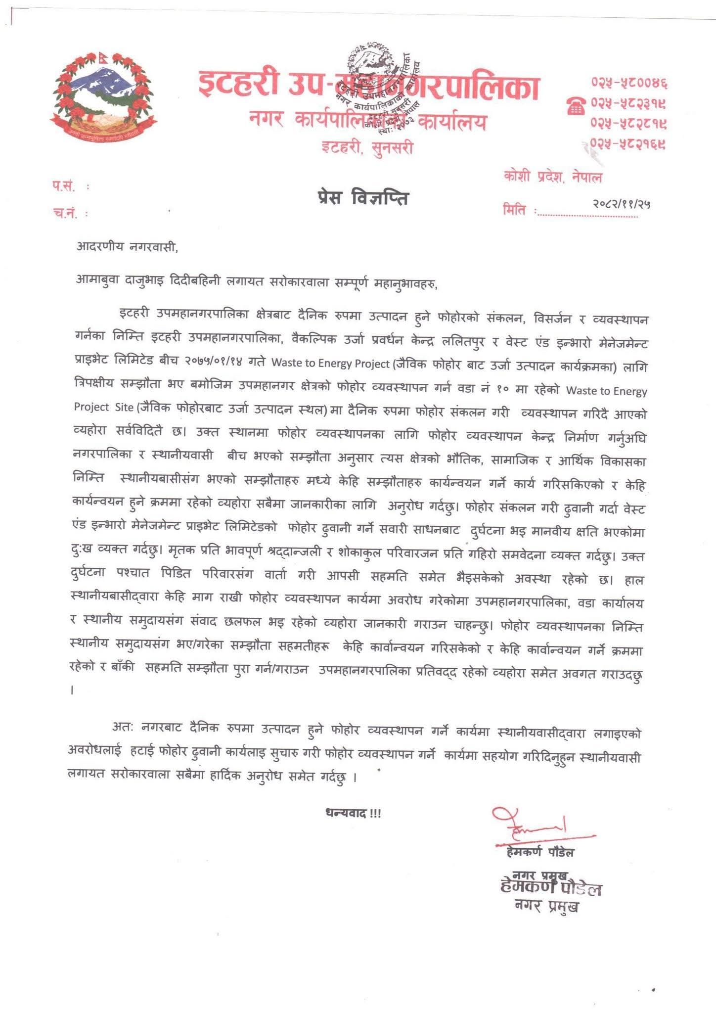 नगरप्रमुख हेमकर्ण पौडेलले एक विज्ञप्ति जारी गर्दै इटहरी उपमहानगरपालिका, वैकल्पिक ऊर्जा प्रवर्द्धन केन्द्र ललितपुर र वेस्ट एन्ड इन्भारो मेनेजमेन्ट प्राइभेट लिमिटेडबीच २०७५ वैशाख १४ गते ‘वेस्ट टु इनर्जी प्रोजेक्ट’ (जैविक फोहोरबाट ऊर्जा उत्पादन कार्यक्रम) सञ्चालनका लागि त्रिपक्षीय सम्झौता भएको स्मरण गराएका छन् ।