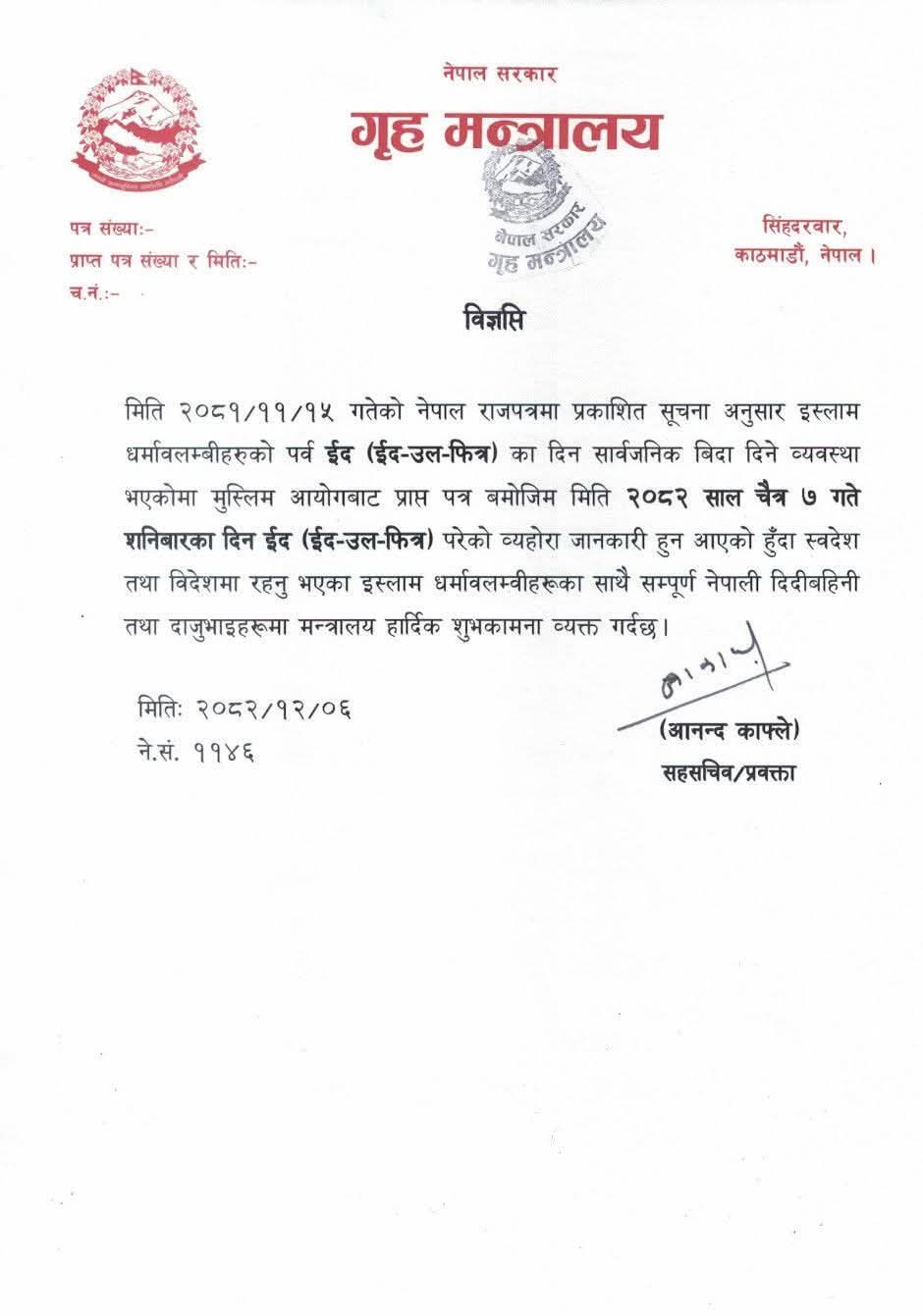 मन्त्रालयका अनुसार मुस्लिम आयोगबाट प्राप्त जानकारी अनुसार यस वर्ष चैत ७ गते शनिवार ईद–उल–फित्र पर्ने भएको छ ।
