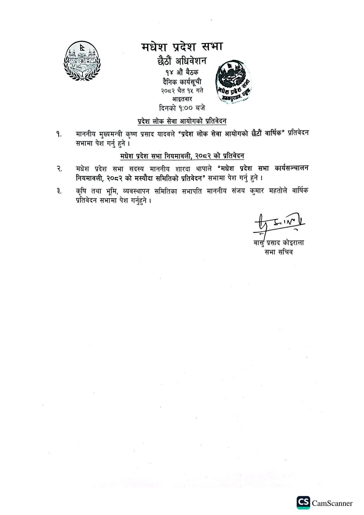 त्यसैगरी, मधेश प्रदेश सभा सदस्य शारदा थापाले ‘मधेश प्रदेश सभा कार्यसञ्चालन नियमावली, २०८२’ को मस्यौदा समितिको प्रतिवेदन प्रस्तुत गर्ने कार्यसूची रहेको छ ।