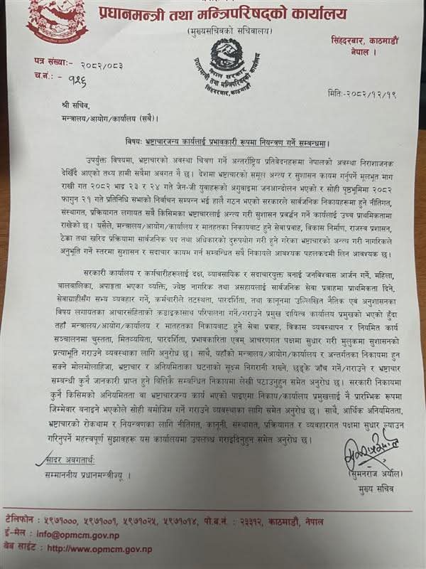 प्रधानमन्त्री तथा मन्त्रिपरिषद् कार्यालयले मुख्यसचिवमार्फत जारी गरेको परिपत्रमा सार्वजनिक सेवा प्रवाहदेखि विकास निर्माण, राजस्व प्रशासन तथा खरिद प्रक्रियामा हुने अनियमितता रोक्न प्रभावकारी कदम चाल्न आग्रह गरिएको हो ।