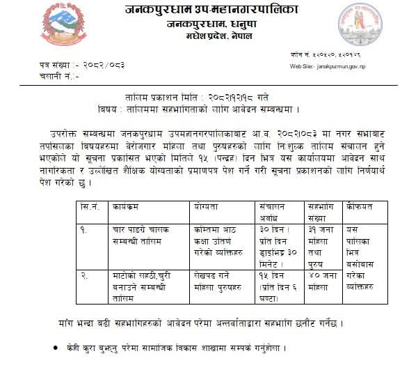 जनकपुरधाम, २० चैत । जनकपुरधाम उपमहानगरपालिकाले बेरोजगार महिला तथा पुरुषलाई लक्षित गर्दै निःशुल्क सीपमूलक तालिम सञ्चालन गर्ने भएको छ ।