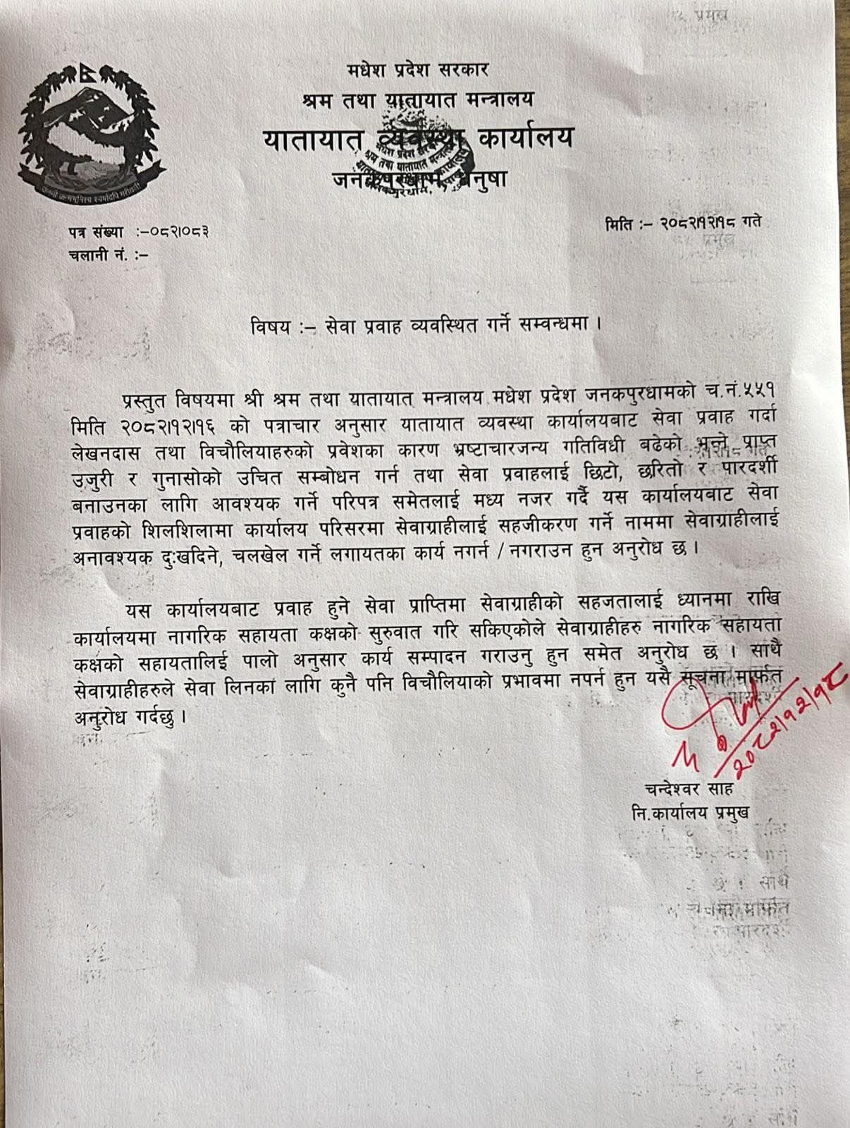 कार्यालय प्रमुख चन्देश्वर साहले सेवाग्राहीको नाममा अनावश्यक दुःख दिने, चलखेल गर्ने वा बिचौलियाको माध्यमबाट सेवा प्रवाह गर्ने कार्य नगर्न कर्मचारीहरूलाई कडा निर्देशन दिएका छन् ।