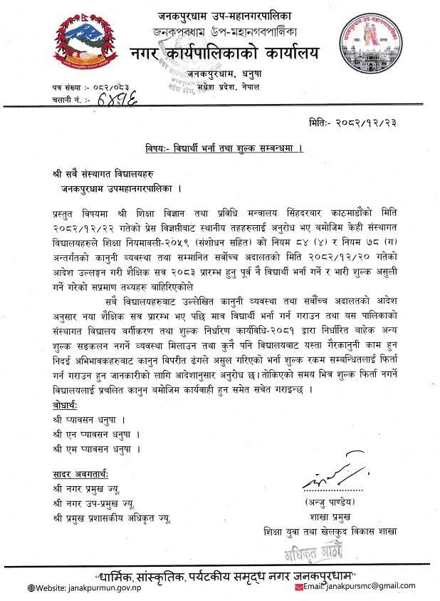 जनकपुरधाममा मनपरी शुल्क असुली रोक्न निर्देशन, अवैध शुल्क फिर्ता गर्न विद्यालयलाई आदेश