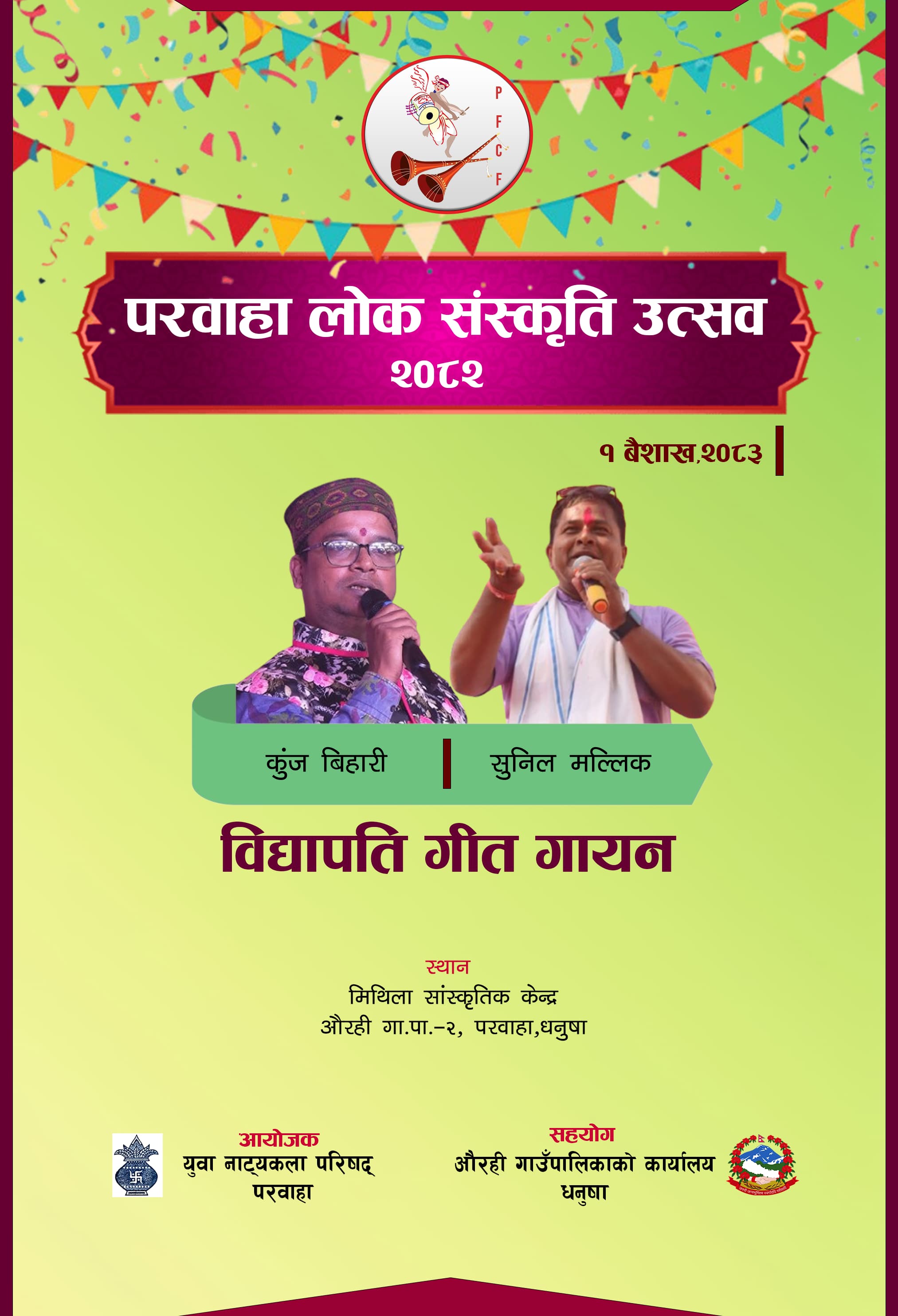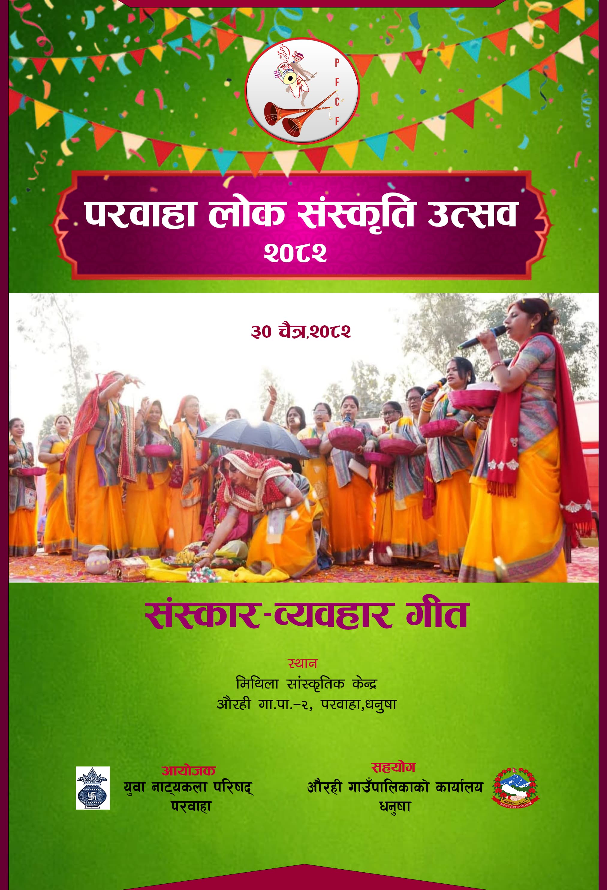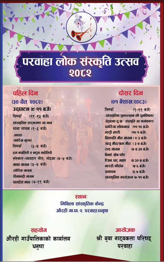 जनकपुरधाम, २६ चैत । धनुषाको औरही गाउँपालिका–२ परवाहामा स्थानीय लोक संस्कृतिको संरक्षण, प्रवर्द्धन तथा पुस्तान्तरण गर्ने उद्देश्यले दुई दिने ‘परवाहा लोक संस्कृति उत्सव २०८२’ आयोजना हुने भएको छ ।