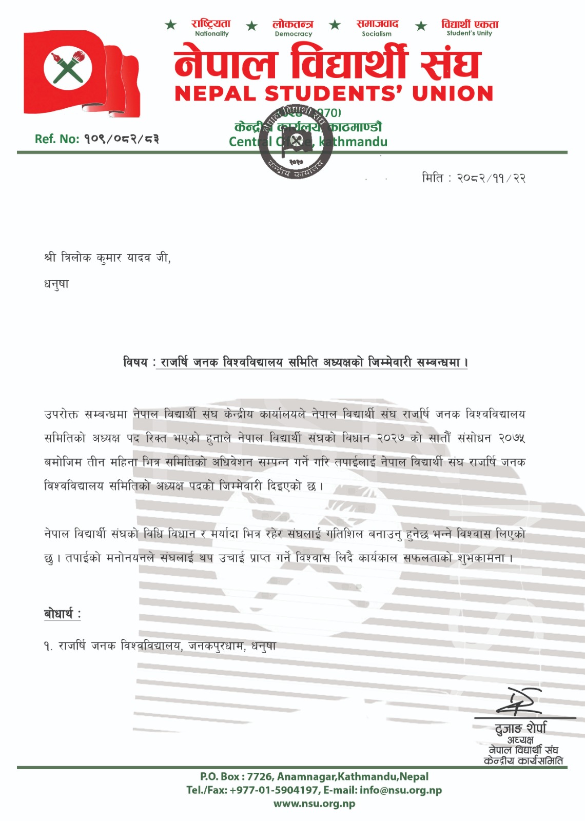 संघको केन्द्रीय कार्यालय काठमाडौंबाट जारी पत्रअनुसार विश्वविद्यालय समितिको अध्यक्ष पद रिक्त रहेकाले विधानअनुसार यादवलाई उक्त जिम्मेवारी दिइएको उल्लेख गरिएको छ ।