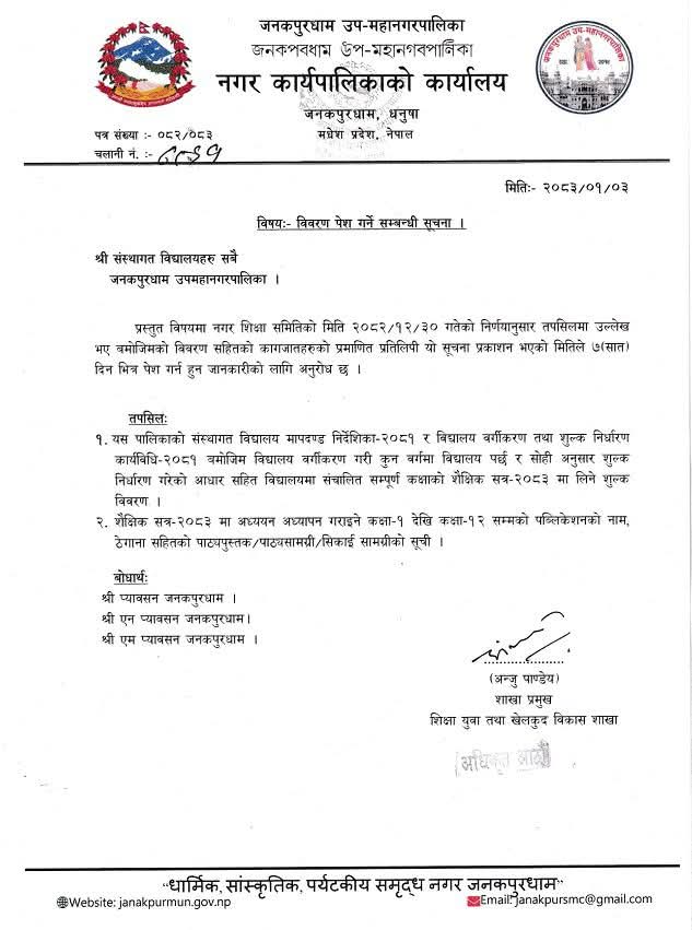 जनकपुरधाम उपमहानगरपालिकाद्वारा संस्थागत विद्यालयलाई विवरण पेश गर्न निर्देशन