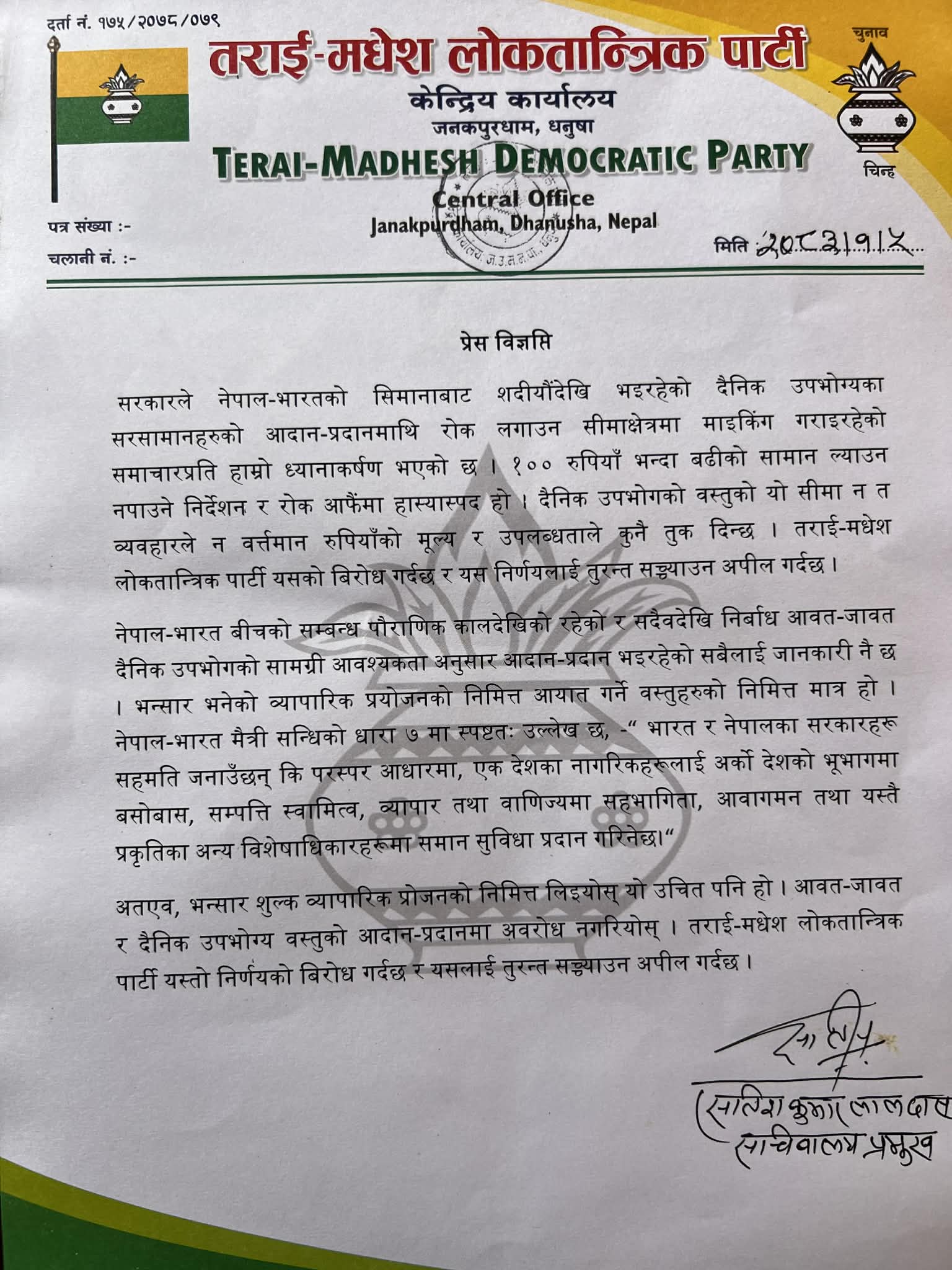 तराई–मधेश लोकतान्त्रिक पार्टीले सीमाक्षेत्रका नागरिकको दैनिकीमा प्रत्यक्ष असर पर्ने यस्ता निर्णय तत्काल फिर्ता लिन सरकारसँग अपिल गरेको छ ।